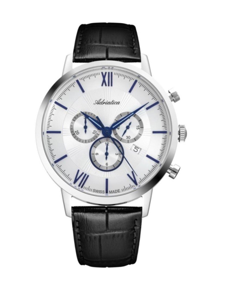 Корпус диаметром 45 мм выполнен из нержавеющей стали 316L . Часы кварцевые с хронографом. Стекло сапфировое. Циферблат серебристого цвета. Черный кожаный ремень. Водозащита 50 метров. Функции: часы, минуты, секунды, дата, хронограф.