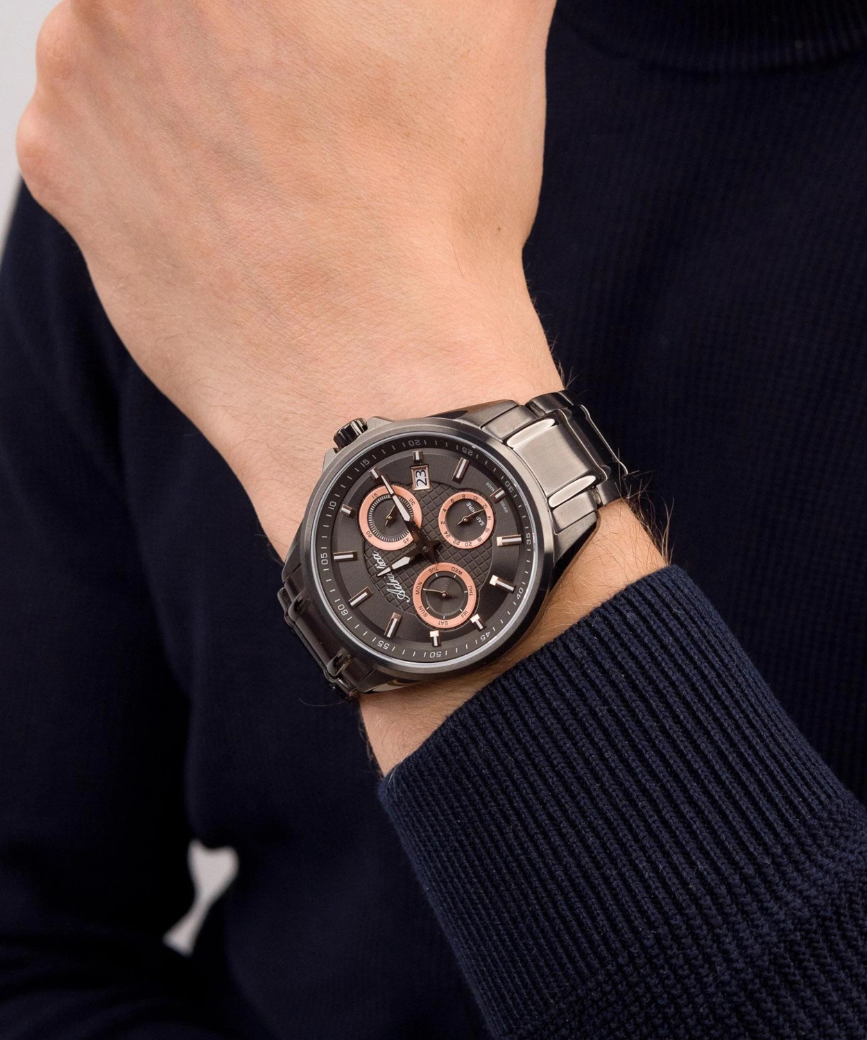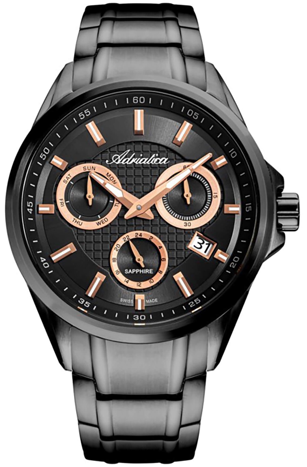 Корпус диаметром 46 мм и браслет выполнены из нержавеющей стали 316L с PVD-покрытием черного цвета. Часы кварцевые. Стекло сапфировое. Циферблат черного цвета. Метки и стрелки часов покрыты люминесцентным составом, что обеспечивает их свечение в темноте. Водозащита 50 метров. Функции: часы, минуты, секунды, дата, день недели, суточная индикация времени.