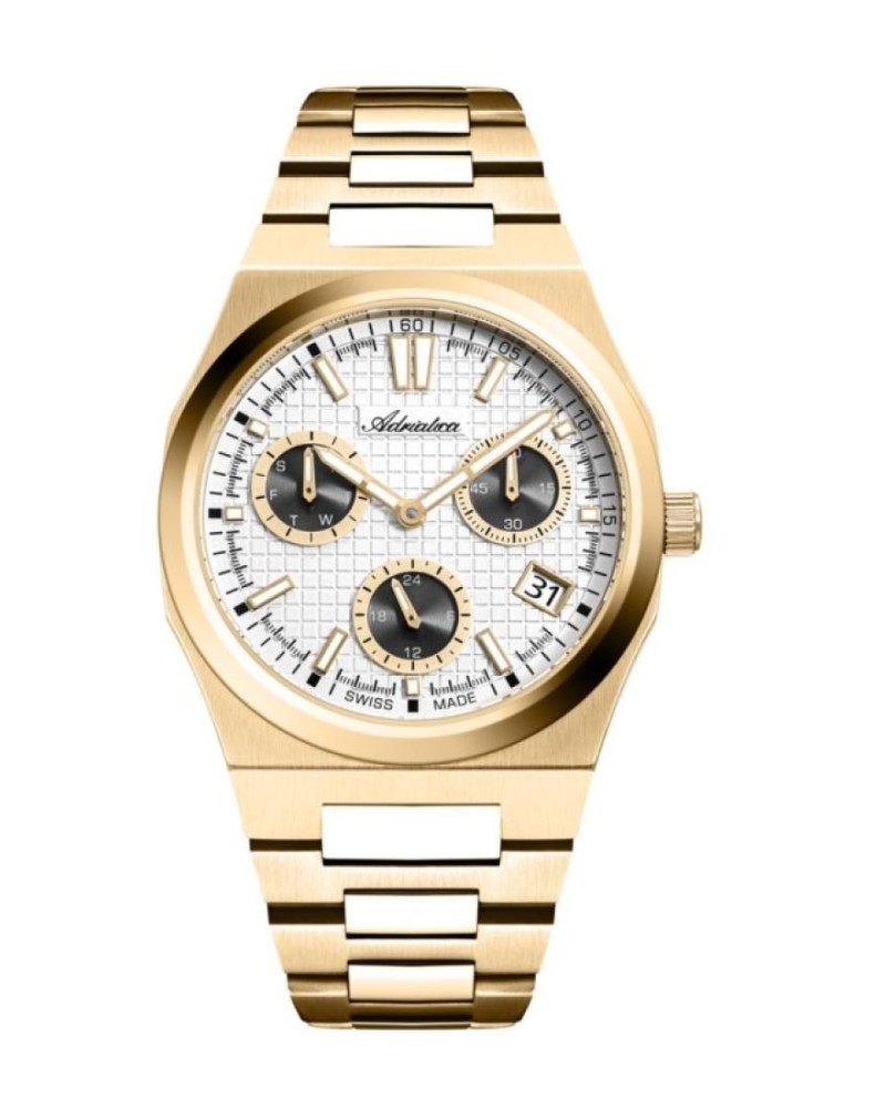 Корпус диаметром 40 мм и браслет выполнены из нержавеющей стали 316L с PVD-покрытием золотого цвета. Часы кварцевые. Стекло сапфировое. Циферблат серебристого цвета. Метки и стрелки часов покрыты люминесцентным составом, что обеспечивает их свечение в темноте. Водозащита 50 метров. Функции: часы, минуты, секунды, дата, суточная индикация.