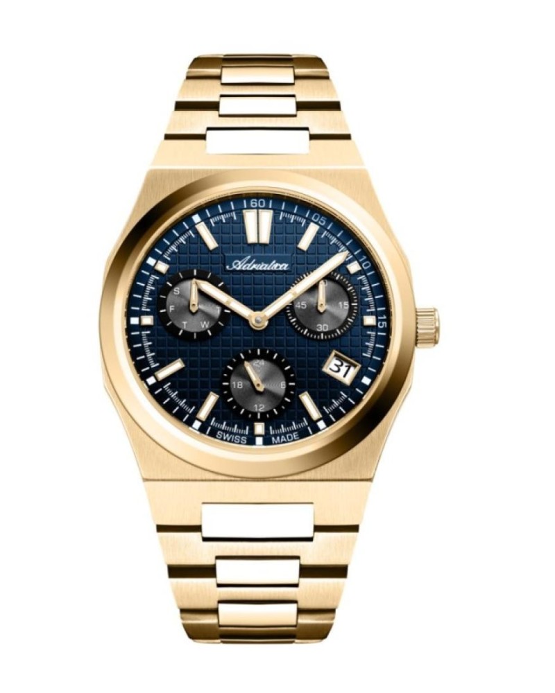 Корпус диаметром 40 мм и браслет выполнены из нержавеющей стали 316L с PVD-покрытием золотого цвета. Часы кварцевые. Стекло сапфировое. Циферблат синего цвета. Метки и стрелки часов покрыты люминесцентным составом, что обеспечивает их свечение в темноте. Водозащита 50 метров. Функции: часы, минуты, секунды, дата, суточная индикация.