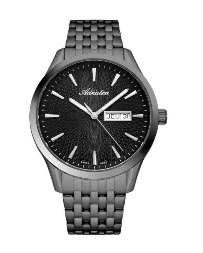 Корпус диаметром 42 мм и браслет выполнены из нержавеющей стали 316L с PVD-покрытием серого цвета. Часы кварцевые. Стекло сапфировое. Циферблат черного цвета. Водозащита 50 метров. Функции: часы, минуты, секунды, дата, день недели.