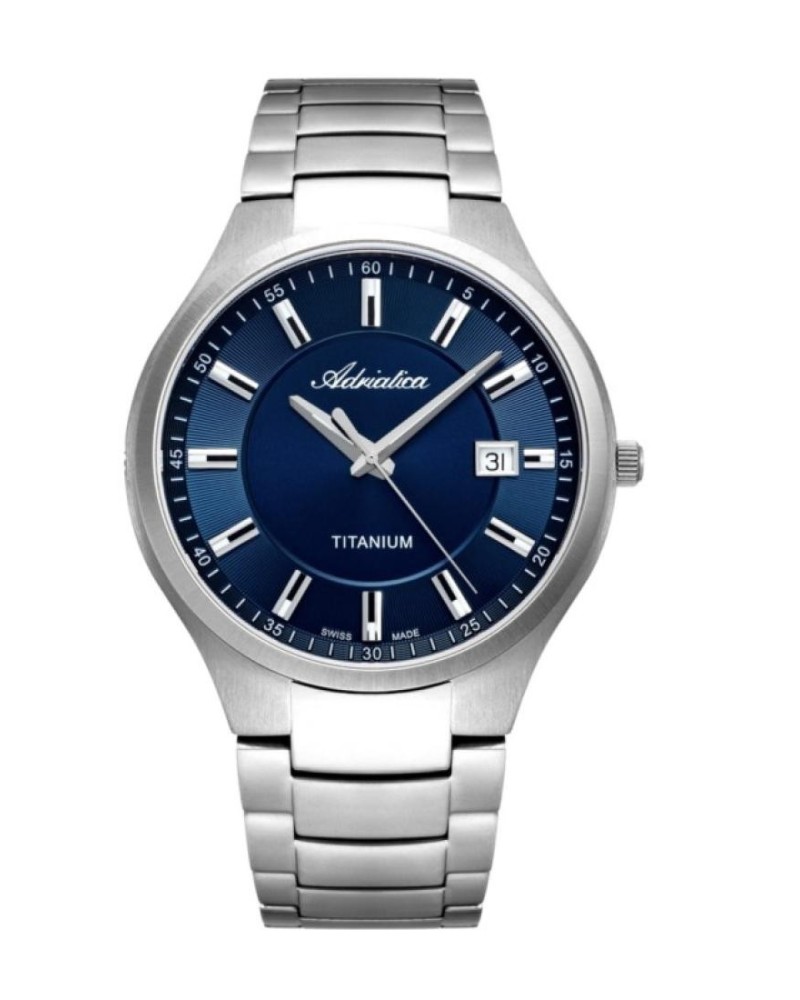 Корпус диаметром 40 мм и браслет выполнены из титана. Часы кварцевые. Стекло сапфировое. Синий циферблат. Стрелки и метки часов покрыты люминесцентным составом, что обеспечивает их свечение в темноте. Водозащита 50 метров. Функции: часы, минуты, секунды, дата.
