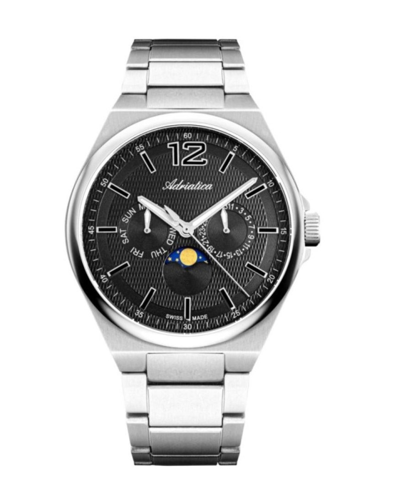Корпус диаметром 42 мм и браслет выполнены из титана. Часы кварцевые. Стекло сапфировое. Черный циферблат. Стрелки часов покрыты люминесцентным составом, что обеспечивает их свечение в темноте. Водозащита 50 метров. Функции: часы, минуты, секунды, дата, день недели, индикация фаз Луны.