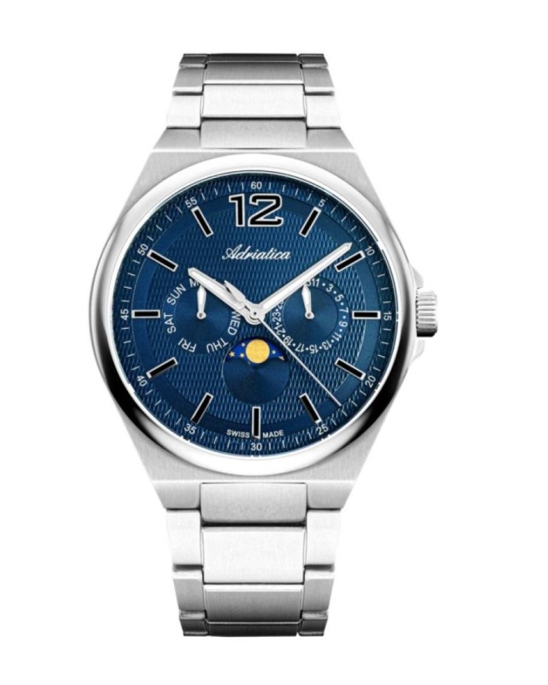 Корпус диаметром 42 мм и браслет выполнены из титана. Часы кварцевые. Стекло сапфировое. Синий циферблат. Стрелки часов покрыты люминесцентным составом, что обеспечивает их свечение в темноте. Водозащита 50 метров. Функции: часы, минуты, секунды, дата, день недели, индикация фаз Луны.