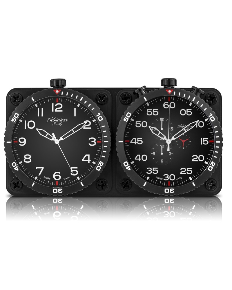 Модель состоит из двух частей.Слева это кварцевые часы, а справа хронограф с функцией флайбэк. Корпуса выполнены из стали 316L с PVD-покрытием черного цвета. Стекла минеральные. Водозащита 30 метров. Крепятся ,например, на стену или приборную панель авто.