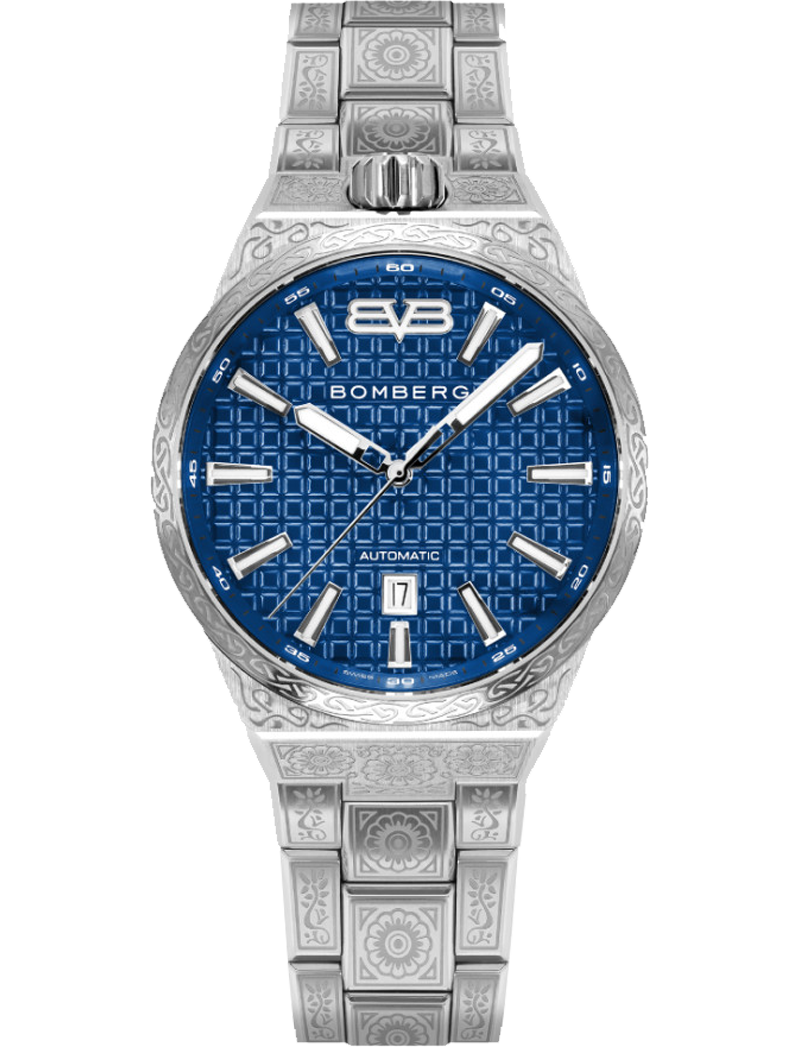 Швейцарские часы BOMBERG BOLT-68 NEO Metropolis выполнены из стали 316L. Корпус диаметром 43 мм и стальной браслет украшены флористическим узором Майя - ветви, листья и цветы мифологического дерева якче. Швейцарский механизм с автоподзаводом и запасом хода 41 час под циферблатом синего цвета. Стальные стрелки и метки покрыты люминисцентным составом Super-LumiNova позволяющим считывать время в темноте. И всё это под сапфировым стеклом с антибликовым покрытием. Функции: часы, минуты, секунды, дата.