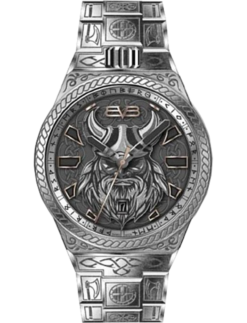 Швейцарские часы BOMBERG BOLT-68 METROPOLIS Viking выполнены из стали 316L. Корпус диаметром 43 мм и браслет украшены скандинавским орнаментом викингов. Часы оснащены швейцарским кварцевым механизмом. Глаза викинга, метки и стрелки часов покрыты люминисцентным составом Super-LumiNova,что обеспечивает их свечение в темноте. И всё это под сапфировым стеклом с антибликовым покрытием. Водозащита 100 метров. Заводная головка завинчивающаяся. Функции: часы, минуты, секунды, дата.