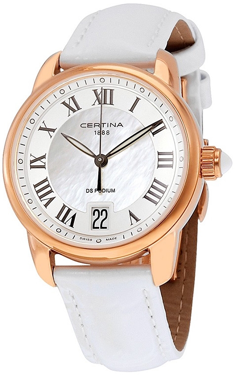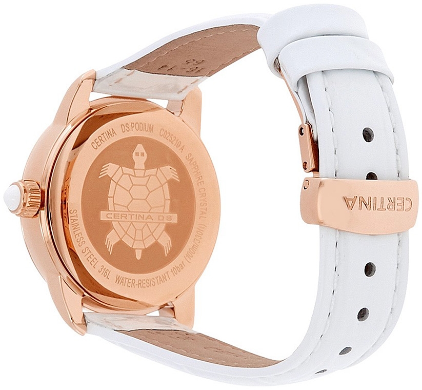 Корпус модели диаметром 33 мм выполнен из стали 316L с PVD-покрытием под "золото". Стекло сапфировое. Перламутровый белый циферблат. Стрелки с люминисцентным покрытием. Швейцарский кварцевый механизм. Водонепроницаемость 100 м. Кожаный ремень с раскладывающейся застежкой. Функции: часы, минуты, секунды, дата.