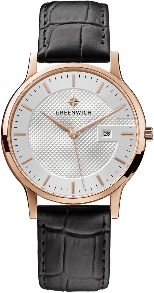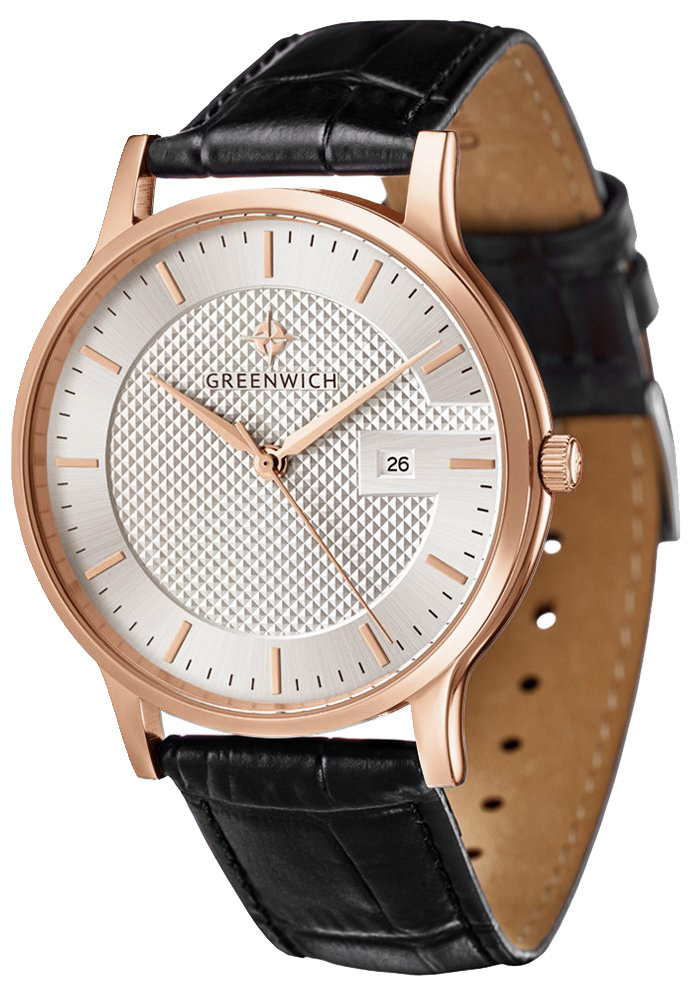 Классические часы с кварцевым механизмом смотрятся элегантно и стильно. Изысканное гильоше по центру белого циферблата придает ему объем и притягивает взгляд. Здесь расположились три стрелки: часовая, минутная и секундная. В часах предусмотрена функция определения даты — в положении «3 часа». Надежный японский механизм обеспечивает бесперебойную работу. Круглый тонкий корпус диаметром 40 мм удобно ложится на запястье. Он выполнен из нержавеющей стали с PVD-покрытием из розового золота. Часы установлены на плотный ремешок из натуральной кожи черного цвета. Прошивка в тон делает его более стойким к износу и позволяет сохранить внешний вид ремешка даже при ежедневном использовании. Классические часы Greenwich — важная деталь вашего образа. Совмещайте эти часы с деловым костюмом или любимыми джинсами: в любой ситуации они будут подчеркивать ваше чувство стиля. Функции: часы, минуты, секунды, дата.