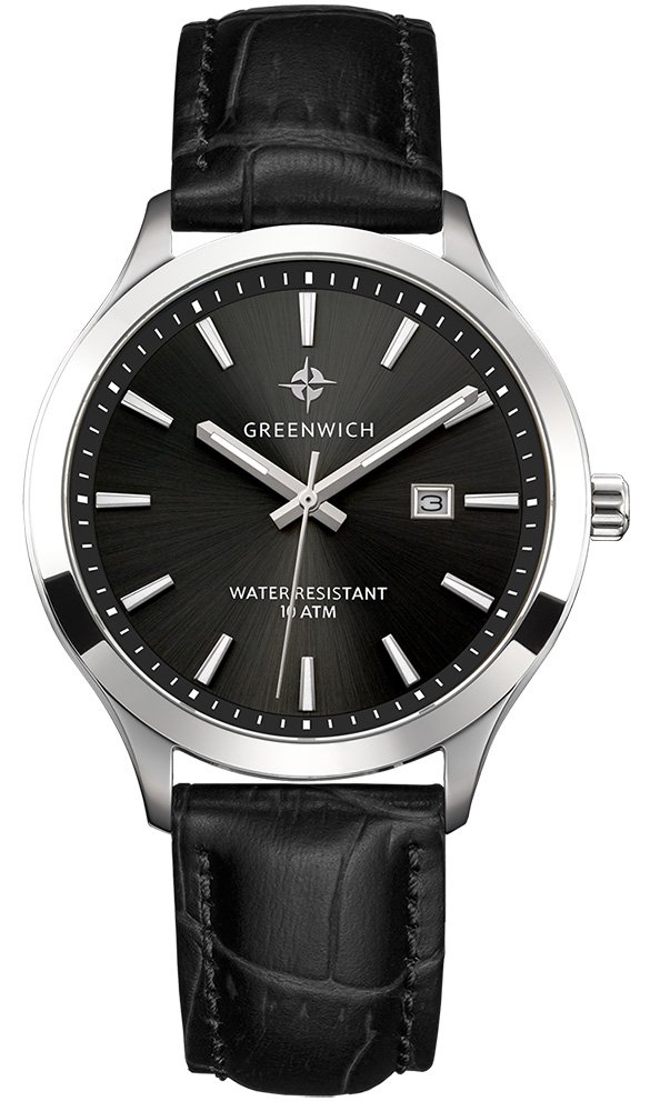 Массивный корпус часов с полированным безелем сделан из гипоаллергенной нержавеющей стали. Она обладает антимагнитным эффектом, повышая, таким образом, точность работы кварцевого механизма. Полированный циферблат черного цвета вмещает крупные часовую и минутную стрелки. Хорошо читается и секундная стрелка, которая отсчитывает секунды по маркированному кругу. Индикатор в положении «3 часа» показывает дату. Надежный японский механизм обеспечивает бесперебойную работу. О качестве часов говорит повышенная водостойкость — 100 метров. Модель дополняет плотный ремешок из натуральной кожи черного цвета с прошивкой. Бренд Greenwich отличается вниманием к деталям. На заводной головке и задней крышке расположился логотип: стилизованное изображение розы ветров. На задней крышке — гравировка корабля, плывущего навстречу приключениям.