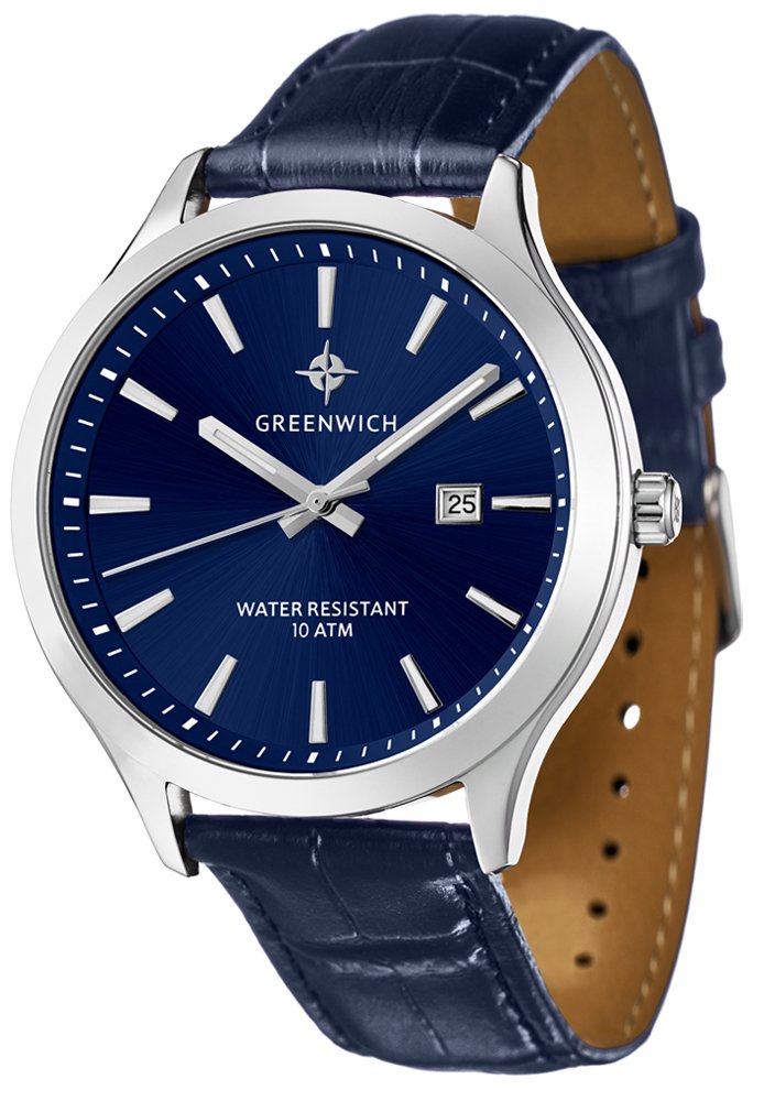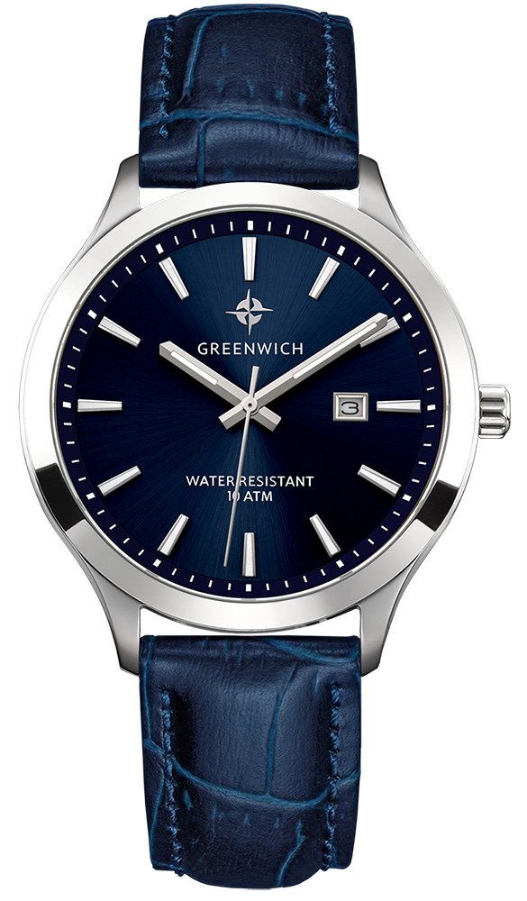 Массивный корпус часов с полированным безелем сделан из гипоаллергенной нержавеющей стали. Она обладает антимагнитным эффектом, повышая, таким образом, точность работы кварцевого механизма. Полированный циферблат синего цвета вмещает крупные часовую и минутную стрелки. Хорошо читается и секундная стрелка, которая отсчитывает секунды по маркированному кругу. Индикатор в положении «3 часа» показывает дату. Надежный японский механизм обеспечивает бесперебойную работу. О качестве часов говорит водостойкость — 100 метров. Модель дополняет плотный ремешок из натуральной кожи синего цвета с прошивкой. Бренд Greenwich отличается вниманием к деталям. На заводной головке и задней крышке расположился логотип: стилизованное изображение розы ветров. На задней крышке — гравировка корабля, плывущего навстречу приключениям.