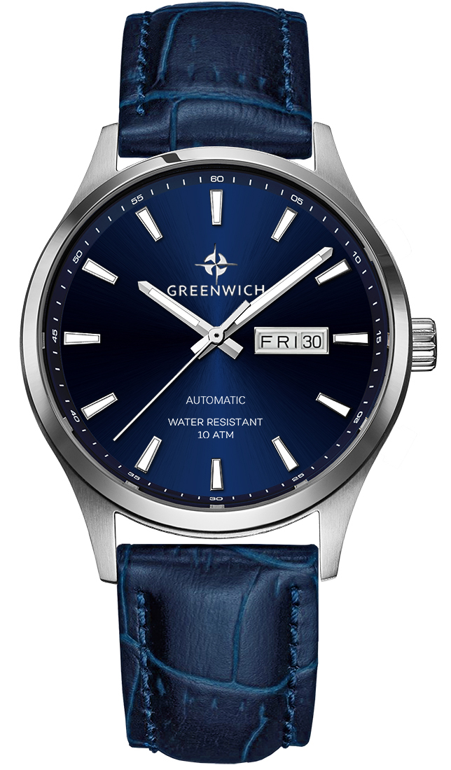 Элегантность, классические линии и уважение традиций задают тон дизайну часов серии Good Luck. Корпус модели, состоящий из трех частей, можно с уверенностью назвать массивным: его диаметр равен 43 мм. Корпус сделан из нержавеющей стали, украшенной двумя видами полировки: зеркальной по безелю и матированием. Задняя крышка прозрачная: вы сможете без проблем любоваться автоматическим механизмом Seiko, на роторе которого выгравирован силуэт парусника, символа английских мореходов, и название серии. На фоне циферблата с полировкой и эффектом градиента расположились накладные риски и крупные стрелки. Они хорошо читаются при любых условиях освещения — люминесцентный состав, которым покрыты эти элементы, светится в темноте. В модели установлено минеральное стекло. Водостойкость составляет 100 метров. Часы дополняет ремешок из натуральной кожи. Автоматические часы Greenwich хорошо подходят для того, чтобы носить их каждый день. Их универсальный дизайн сочетается практически с любыми предметами гардероба, а механизм заводится, находясь на запястье владельца.