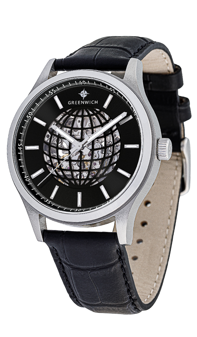 Часы-скелетон - это само по себе произведение часового искусства. А в серии Globe прозрачный циферблат украшает оригинальный элемент, линии параллелей и меридианов которого складываются в очертания глобуса. Задняя крышка модели тоже прозрачная, сквозь нее можно наблюдать за движениями ротора с традиционной уже для бренда гравировкой Good Luck и других деталей автоматического механизма Miyota. На пластине черного цвета закреплены накладные риски. Часовая и минутная стрелки выделены люминесцентным покрытием, которое обладает способностью светиться в темноте. Водостойкость часов Globe равна 10 атмосферам. Корпус модели сделан из нержавеющей стали, ремешок — из натуральной кожи черного цвета. Стальная застежка и удобная заводная головка декорированы логотипом бренда Greenwich. Часы серии Globe - надежный по содержанию и впечатляющий по исполнению аксессуар, механизм которого будет заряжаться от движений руки, находясь на запястье владельца.