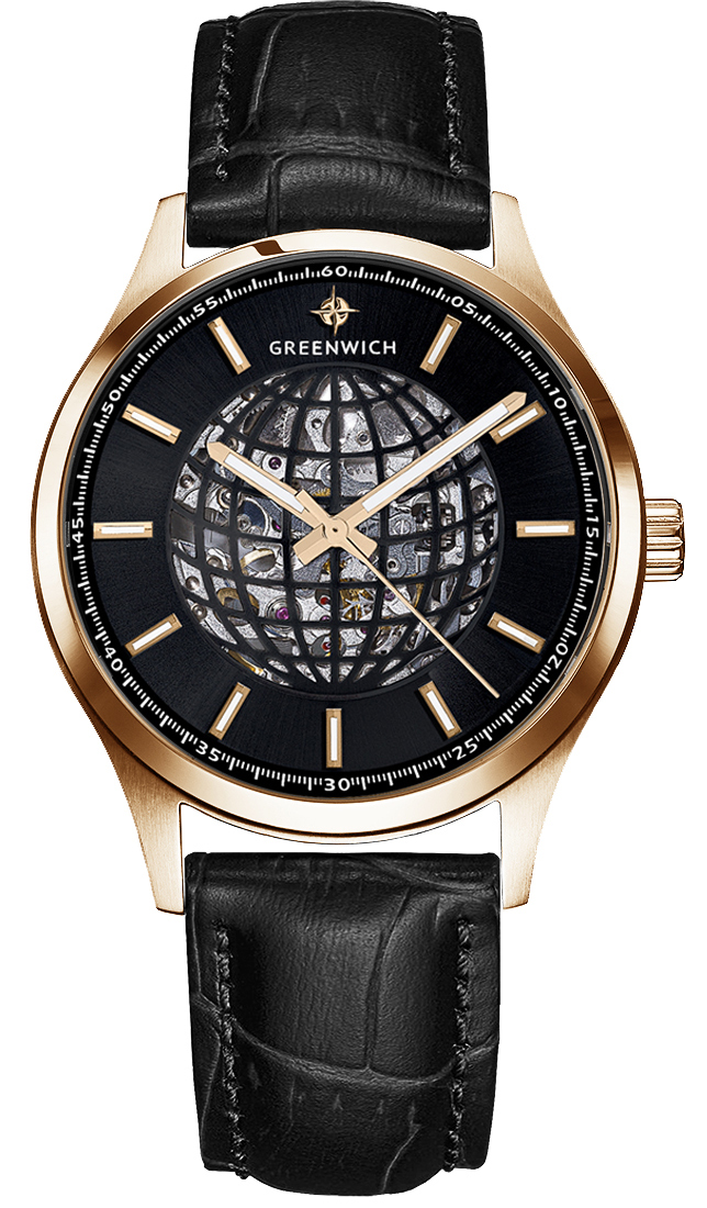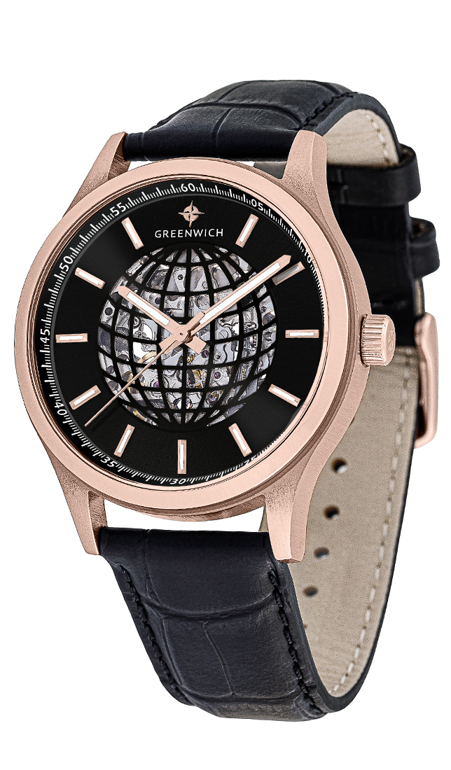 Часы-скелетон - это само по себе произведение часового искусства. А в серии Globe прозрачный циферблат украшает оригинальный элемент, линии параллелей и меридианов которого складываются в очертания глобуса. Задняя крышка модели тоже прозрачная, сквозь нее можно наблюдать за движениями ротора с традиционной уже для бренда гравировкой Good Luck и других деталей автоматического механизма Miyota. На пластине черного цвета закреплены накладные риски. Часовая и минутная стрелки выделены люминесцентным покрытием, которое обладает способностью светиться в темноте. Водостойкость часов Globe равна 10 атмосферам. Корпус модели сделан из нержавеющей стали с PVD-покрытием из розового золота, ремешок — из натуральной кожи черного цвета. Стальная застежка и удобная заводная головка декорированы логотипом бренда Greenwich. Часы серии Globe - надежный по содержанию и впечатляющий по исполнению аксессуар, механизм которого будет заряжаться от движений руки, находясь на запястье владельца.