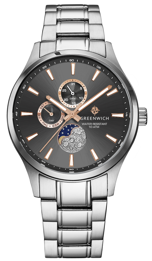 В круглом корпусе из нержавеющей стали заключен кварцевый механизм с полезными функциями даты, дня недели и фаз Луны. Каждый индикатор, расположенный на сером матовом циферблате, выделен накладной рамкой. Индикатор в позиции «6 часов» украшает декоративный элемент с объемным рисунком, который напоминает кратеры на лунной поверхности. Стрелки и риски покрыты люминесцентным составом, который светится в темноте. Повышенная водостойкость часов составляет 100 метров. Модель дополняет классический браслет из нержавеющей стали с удобной в использовании и надежной застежкой-клипсой.