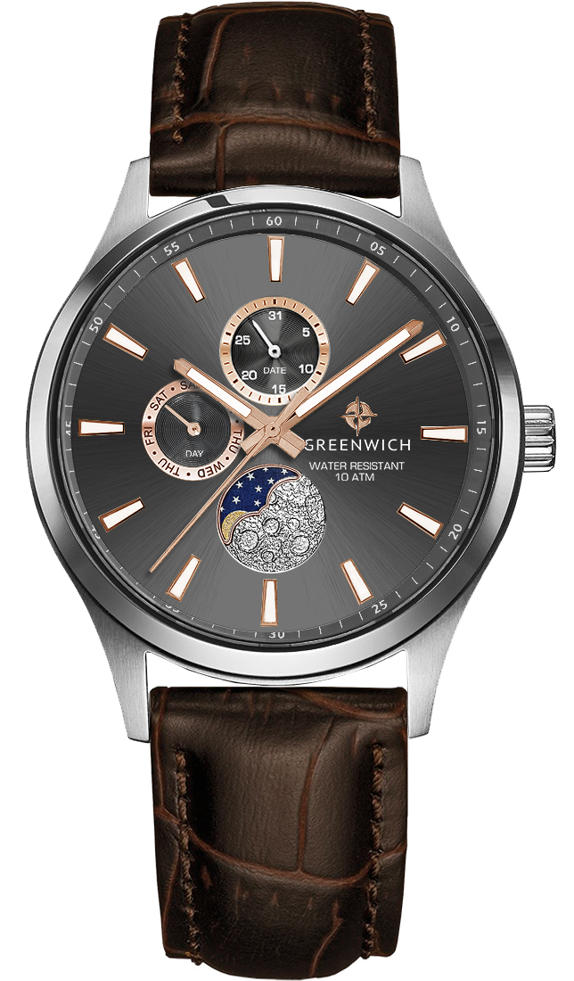 В круглом корпусе из нержавеющей стали заключен кварцевый механизм с полезными функциями даты, дня недели и фаз Луны. Каждый индикатор, расположенный на сером циферблате, выделен накладной рамкой. Индикатор в позиции «6 часов» украшает декоративный элемент с объемным рисунком, который напоминает кратеры на лунной поверхности. Стрелки и риски покрыты люминесцентным составом, который светится в темноте. Повышенная водостойкость часов составляет 100 метров. Часы установлены на плотный ремешок из натуральной кожи коричневого цвета с прошивкой, которая делает ремешок более износостойким.