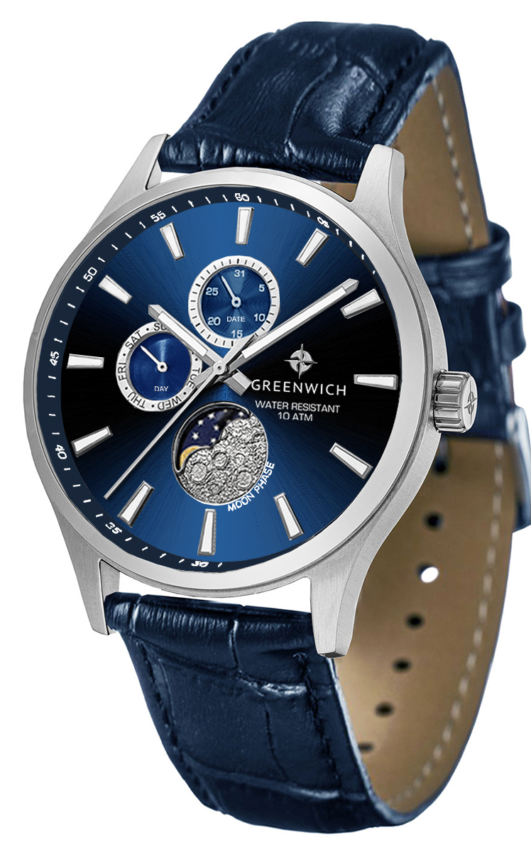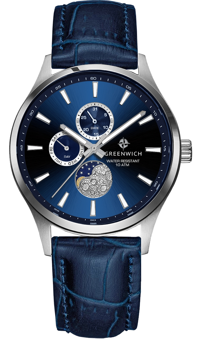В часах привлекает сочетание спортивного дизайна и классических линий корпуса из нержавеющей стали. Кварцевый механизм показывает время с точностью до секунды, дату, день недели. Все индикаторы на синем циферблате хорошо читаются, они выделены накладными рамками с зеркальной полировкой. В позиции «6 часов» расположен индикатор лунных фаз. Его украшением служит элемент с объемным рисунком, напоминающем изрытую кратерами поверхность спутника нашей планеты. Крупные стрелки и риски видны при любых условиях благодаря люминесцентному покрытию, которое в темноте светится приятным для глаз зеленоватым свечением. Повышенная водостойкость равна 100 метрам. Ремешок из натуральной кожи синего цвета с прошивкой удерживает на запястье застежка-пряжка с логотипом бренда.