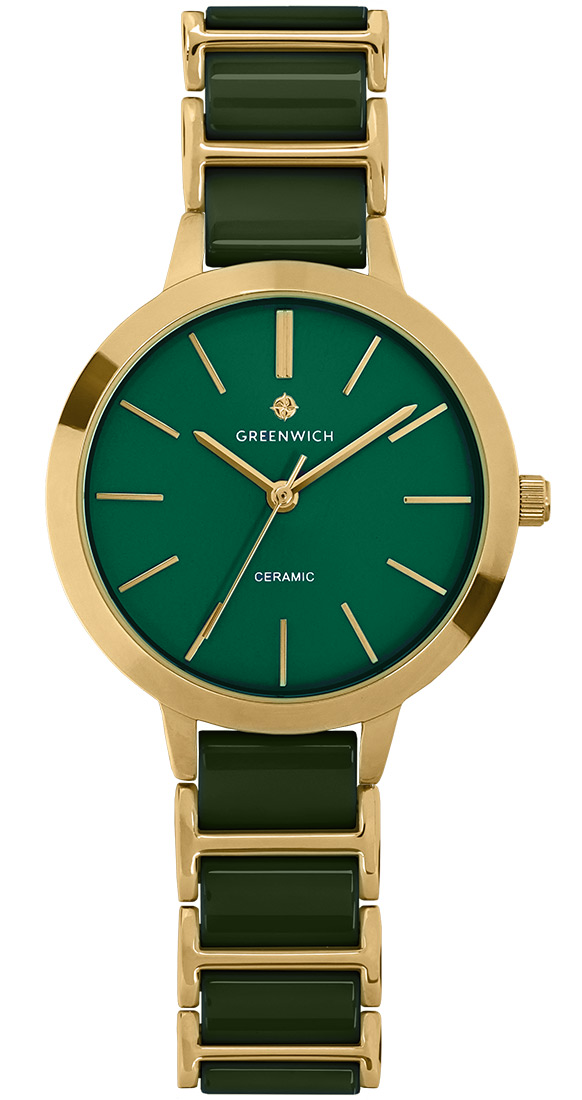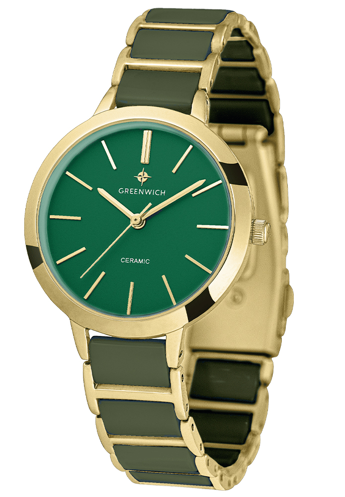 Кварцевые часы серии Fortune созданы для поклонников минимализма. Диаметр круглого корпуса из прочной нержавеющей стали равен 32 мм, а это значит, что их могут смело выбирать даже обладательницы самого изящного запястья. В качестве декора дизайнеры бренда используют PVD-покрытие из желтого золота. Темно-зеленый матовый циферблат дополнен прямыми линиями рисок и стрелок часов, минут и секунд. Браслет состоит из двух частей: полированное обрамление из нержавеющей стали и звенья темно-зеленого цвета из высокотехнологичной керамики. Благодаря такому сочетанию браслет надолго сохранит первоначальный внешний вид (керамика известна своей стойкостью к появлению микроцарапин, а стальные элементы защищают ее от соприкосновения с поверхностями). Застежка-клипса с двумя боковыми кнопками удобна в использовании и поможет предотвратить падение часов при случайном расстегивании.