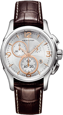 Корпус, Hamilton Jazzmaster Chrono Quartz диаметром 42 мм выполнен из нержавеющей стали 316L. Часы кварцевые с хронографом. Стекло сапфировое. Циферблат серебристого цвета. Стрелки часов покрыты люминесцентным составом,что обеспечивает их свечение в темноте. Коричневый кожаный ремень. Водозащита 100 метров. Функции: часы, минуты, секунды, дата, хронограф.