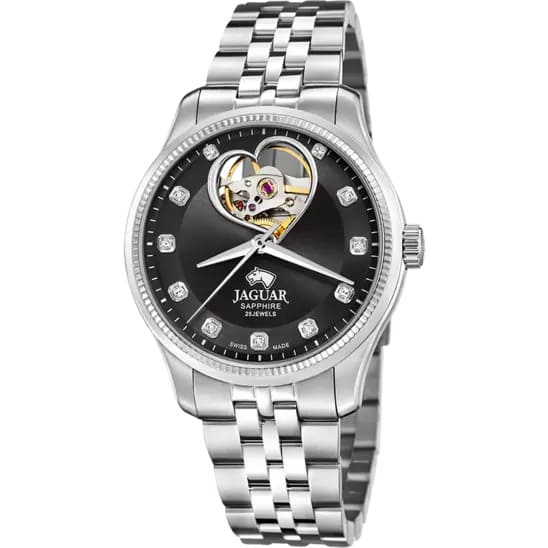 Женские швейцарские часы JAGUAR из коллекции CŒUR. Модель J994/3 черного цвета с черным циферблатом и циркониевыми индексами обеспечивает идеальную читаемость благодаря сапфировому стеклу с антибликовым покрытием. JAGUAR J994/3 - это часы с автоматическим механизмом P024BV-003H1 (AUTOMATICO) швейцарского производства, качество и точность которого проверены годами, и которые с высокой надежностью показывают часы, минуты и секунды. Эти часы изготовлены из нержавеющей стали 316L Этот тип стали, благодаря своему составу, особенно устойчив к коррозии и обладает высокой прочностью. Это также гипоаллергенный материал хирургического класса, что позволяет избежать возможных кожных реакций при длительном использовании. Эти часы оснащены стальным браслетом из нержавеющей стали и скрытой застежкой, которая создает ощущение непрерывного, бесшовного ремешка на запястье. С момента своего основания в 1938 году марка часов Jaguar оставалась верна ценностям, которые подтолкнули ее основателя к созданию нового часового бренда: стремление к абсолютной красоте и прочности в каждом производимом изделии. Для достижения этой цели в Jaguar верны традициям высокоточного швейцарского часового дела, применяя самые передовые технологии, гарантирующие владельцам часов Jaguar высочайшую надежность и точность. Функции: часы, минуты, секунды.