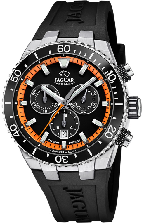 Мужские швейцарские часы JAGUAR из коллекции CERAMIC. Модель J1021/4 черного цвета с черным циферблатом и серебряными индексами обеспечивает идеальную читаемость благодаря сапфировому стеклу с антибликовым покрытием. JAGUAR J1021/4 - это кварцевые часы швейцарского производства с механизмом RONDA 5030D-6H1, качество и точность которого проверены годами. Они оснащены функцией хронографа, с помощью которой вы сможете измерять время с высокой точностью. Эти часы изготовлены из нержавеющей стали и керамики. Нержавеющая сталь 316L, также известная как хирургическая сталь, представляет собой специальный сплав с высокой устойчивостью к коррозии. Кроме того, этот гипоаллергенный хирургический материал предотвращает возможные кожные реакции при длительном использовании. Кроме того, благодаря керамической вставке на безеле часы практически не царапаются и имеют меньший вес. Этот материал придает часам очень элегантную и технологичную отделку. Эти часы оснащены черным каучуковым ремешком и классической застежкой-пряжкой - идеальной системой крепления кожаного ремешка, которая гарантирует, что часы всегда будут надежно закреплены на месте. С момента своего основания в 1938 году марка часов Jaguar оставалась верна ценностям, которые подтолкнули ее основателя к созданию нового часового бренда: стремление к абсолютной красоте и прочности в каждом производимом изделии. Для достижения этой цели в Jaguar верны традициям высокоточного швейцарского часового дела, применяя самые передовые технологии, гарантирующие владельцам часов Jaguar высочайшую надежность и точность. Функции: часы, минуты, секунды, хронограф, дата.