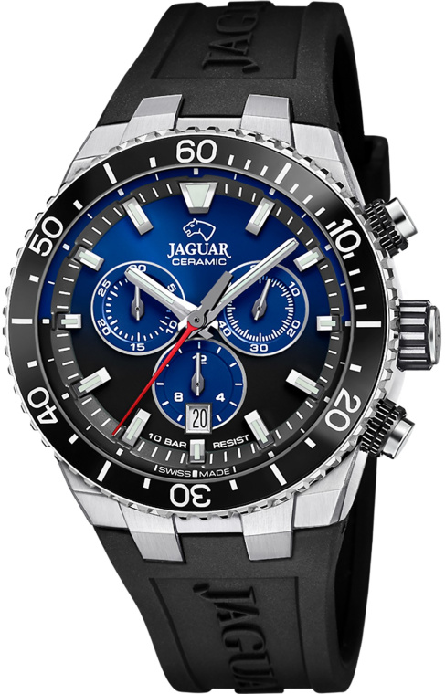 Мужские швейцарские часы JAGUAR из коллекции CERAMIC. Модель J1021/6 черного цвета с черным циферблатом и серебряными индексами обеспечивает идеальную читаемость благодаря сапфировому стеклу с антибликовым покрытием. JAGUAR J1021/6 - это кварцевые часы швейцарского производства с механизмом RONDA 5030D-6H1, качество и точность которого проверены годами. Они оснащены функцией хронографа, с помощью которой вы сможете измерять время с высокой точностью. Эти часы изготовлены из нержавеющей стали и керамики. Нержавеющая сталь 316L, также известная как хирургическая сталь, представляет собой специальный сплав с высокой устойчивостью к коррозии. Кроме того, этот гипоаллергенный хирургический материал предотвращает возможные кожные реакции при длительном использовании. Кроме того, благодаря керамической вставке на безеле часы практически не царапаются и имеют меньший вес. Этот материал придает часам очень элегантную и технологичную отделку. Эти часы оснащены синим каучуковым ремешком и классической застежкой-пряжкой - идеальной системой крепления кожаного ремешка, которая гарантирует, что часы всегда будут надежно закреплены на месте. С момента своего основания в 1938 году марка часов Jaguar оставалась верна ценностям, которые подтолкнули ее основателя к созданию нового часового бренда: стремление к абсолютной красоте и прочности в каждом производимом изделии. Для достижения этой цели в Jaguar верны традициям высокоточного швейцарского часового дела, применяя самые передовые технологии, гарантирующие владельцам часов Jaguar высочайшую надежность и точность. Функции: часы, минуты, секунды, хронограф, дата.