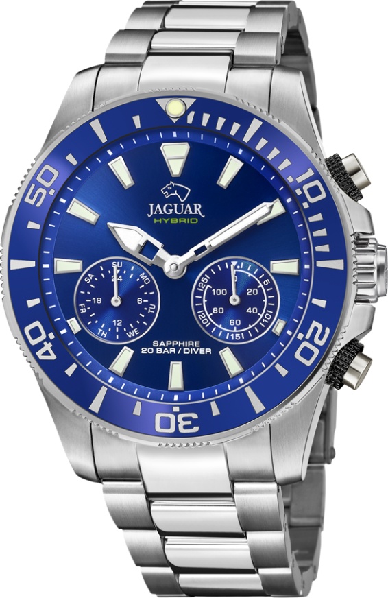 Мужские швейцарские часы JAGUAR из коллекции CONNECTED MEN. Модель J888/1 синего цвета с синим циферблатом и серебряными индексами обеспечивает идеальную читаемость благодаря сапфировому стеклу с антибликовым покрытием. JAGUAR J888/1 - это гибридные часы. Благодаря технологии Jaguar connected, эти часы способны предложить своему владельцу интеллектуальные функции. Эти часы изготовлены из нержавеющей стали 316L Этот тип стали, благодаря своему составу, особенно устойчив к коррозии и обладает высокой прочностью. Это также гипоаллергенный материал хирургического класса, что позволяет избежать возможных кожных реакций при длительном использовании. Эти часы оснащены серебристым браслетом из нержавеющей стали и раскладывающейся застежкой, которая позволяет легко и точно регулировать размер ремешка, чтобы часы наилучшим образом сидели на вашем запястье. С момента своего основания в 1938 году марка часов Jaguar оставалась верна ценностям, которые подтолкнули ее основателя к созданию нового часового бренда: стремление к абсолютной красоте и прочности в каждом производимом изделии. Для достижения этой цели в Jaguar верны традициям высокоточного швейцарского часового дела, применяя самые передовые технологии, гарантирующие владельцам часов Jaguar высочайшую надежность и точность. Функции: часы, минуты, хронограф, дата, день недели, второй часовой пояс, синхронизация со смартфоном по сети Bluetooth, фильтр оповещений и звонков, поиск местоположения часов/смартфона и другие.
