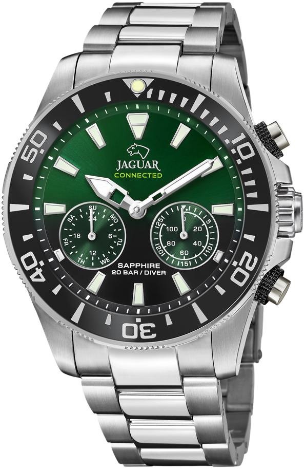 Мужские швейцарские часы JAGUAR из коллекции CONNECTED MEN. Модель J888/5 зеленого цвета с зеленым циферблатом и серебряными индексами обеспечивает идеальную читаемость благодаря сапфировому стеклу с антибликовым покрытием. JAGUAR J888/5 - это гибридные часы. Благодаря технологии Jaguar connected, эти часы способны предложить своему владельцу интеллектуальные функции. Эти часы изготовлены из нержавеющей стали 316L Этот тип стали, благодаря своему составу, особенно устойчив к коррозии и отличается высокой прочностью. Это также гипоаллергенный материал хирургического класса, что позволяет избежать возможных кожных реакций при длительном использовании. Эти часы оснащены серебристым браслетом из нержавеющей стали и раскладывающейся застежкой, которая позволяет легко и точно регулировать размер ремешка, чтобы часы наилучшим образом сидели на вашем запястье. С момента своего основания в 1938 году марка часов Jaguar оставалась верна ценностям, которые подтолкнули ее основателя к созданию нового часового бренда: стремление к абсолютной красоте и прочности в каждом производимом изделии. Для достижения этой цели в Jaguar верны традициям высокоточного швейцарского часового дела, применяя самые передовые технологии, гарантирующие владельцам часов Jaguar высочайшую надежность и точность. Функции: часы, минуты, хронограф, дата, день недели, второй часовой пояс, синхронизация со смартфоном по сети Bluetooth, фильтр оповещений и звонков, поиск местоположения часов/смартфона и другие.