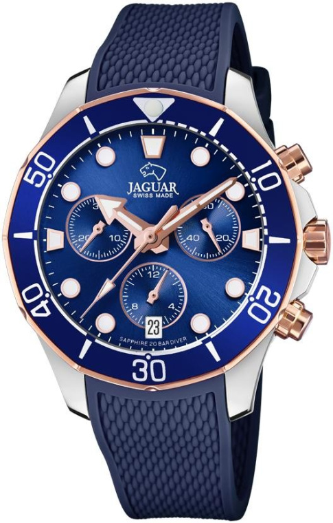 Женские швейцарские часы JAGUAR из коллекции COUPLE DIVER. Модель J890/4 синего цвета с синим циферблатом и розовыми индексами обеспечивает идеальную читаемость благодаря сапфировому стеклу c антибликовым покрытием. JAGUAR J890/4 - это кварцевые часы швейцарского производства с механизмом RONDA 5030D-6H1, качество и точность которого проверены годами. Они оснащены функцией хронографа, с помощью которой вы сможете измерять время с высокой точностью. Эти часы изготовлены из нержавеющей стали 316L Этот тип стали, благодаря своему составу, особенно устойчив к коррозии и обладает высокой прочностью. Это также гипоаллергенный материал хирургического класса, что позволяет избежать возможных кожных реакций при длительном использовании. Эти часы оснащены фиолетовым каучуковым ремешком и классической застежкой-пряжкой. С момента своего основания в 1938 году марка часов Jaguar оставалась верна ценностям, которые подтолкнули ее основателя к созданию нового часового бренда: стремление к абсолютной красоте и прочности в каждом производимом изделии. Для достижения этой цели в Jaguar верны традициям высокоточного швейцарского часового дела, применяя самые передовые технологии, гарантирующие владельцам часов Jaguar высочайшую надежность и точность. Функции: часы, минуты, секунды, дата, хронограф.