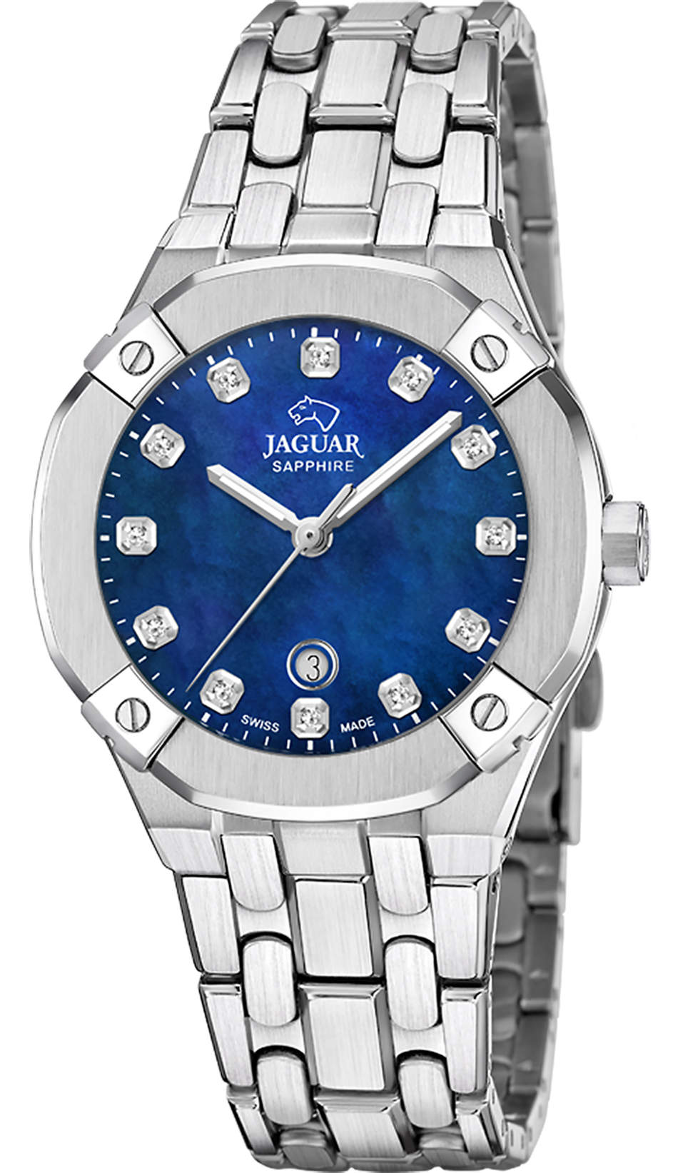 Женские швейцарские часы JAGUAR из коллекции DIPLOMATIC. Модель J1016/6 с синим перламутровым циферблатом и индексами с цирконами обеспечивает идеальную читаемость благодаря сапфировому стеклу с антибликовым покрытием. JAGUAR J1016/6 - это кварцевые часы швейцарского производства с механизмом HARLEY 785 , качество и точность которого проверены годами и который с высокой надежностью показывает часы, минуты и секунды. Эти часы изготовлены из нержавеющей стали 316L. Этот тип стали, благодаря своему составу, особенно устойчив к коррозии и отличается высокой прочностью. Это также гипоаллергенный материал хирургического класса, что позволяет избежать возможных кожных реакций при длительном использовании. Эти часы оснащены серебристым браслетом из нержавеющей стали и раскладывающейся застежкой, которая позволяет легко и точно регулировать размер ремешка, чтобы часы наилучшим образом сидели на вашем запястье. С момента своего основания в 1938 году марка часов Jaguar оставалась верна ценностям, которые подтолкнули ее основателя к созданию нового часового бренда: стремление к абсолютной красоте и прочности в каждом производимом изделии. Для достижения этой цели в Jaguar верны традициям высокоточного швейцарского часового дела, применяя самые передовые технологии, гарантирующие владельцам часов Jaguar высочайшую надежность и точность. Функции: часы, минуты, секунды, дата.