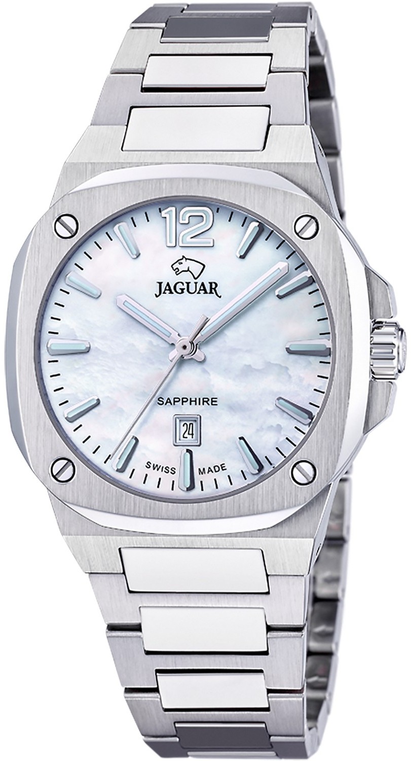 Женские швейцарские часы JAGUAR из коллекции JAGUAR ROND CARRE. Модель J1027/1 с перламутровым циферблатом и серебряными индексами обеспечивает идеальную читаемость благодаря сапфировому стеклу с антибликовым покрытием. JAGUAR J1027/1 - это кварцевые часы швейцарского производства с механизмом HARLEY 785 , качество и точность которого проверены годами и который с высокой надежностью показывает часы, минуты и секунды. Эти часы изготовлены из нержавеющей стали 316L. Этот тип стали, благодаря своему составу, особенно устойчив к коррозии и отличается высокой прочностью. Это также гипоаллергенный материал хирургического класса, что позволяет избежать возможных кожных реакций при длительном использовании. Эти часы оснащены серебряным браслетом из нержавеющей стали и скрытой застежкой, которая создает ощущение непрерывного, бесшовного ремешка на запястье. С момента своего основания в 1938 году марка часов Jaguar оставалась верна ценностям, которые подтолкнули ее основателя к созданию нового часового бренда: стремление к абсолютной красоте и прочности в каждом производимом изделии. Для достижения этой цели в Jaguar верны традициям высокоточного швейцарского часового дела, применяя самые передовые технологии, гарантирующие владельцам часов Jaguar высочайшую надежность и точность. Функции: часы, минуты, секунды, дата.