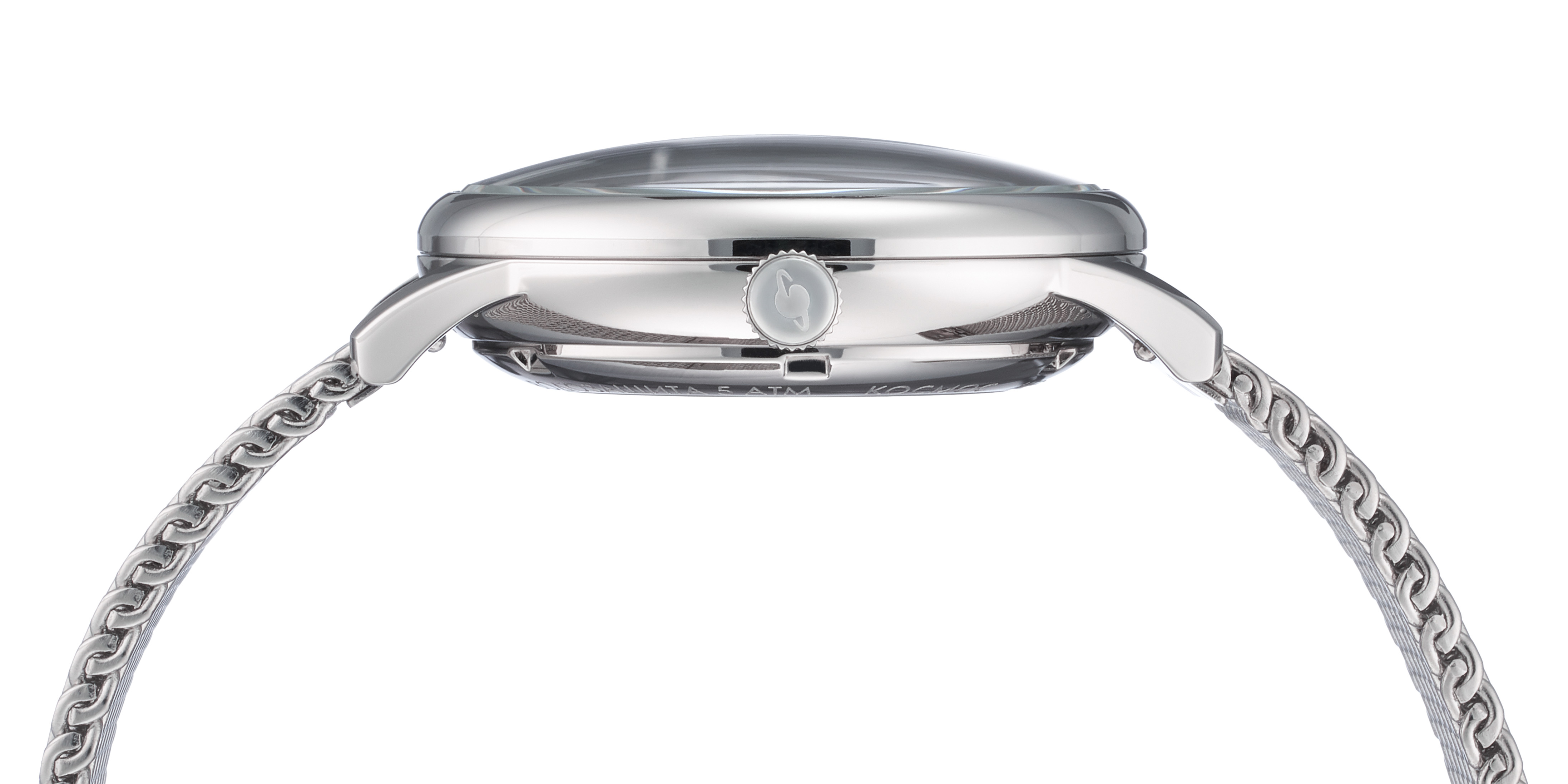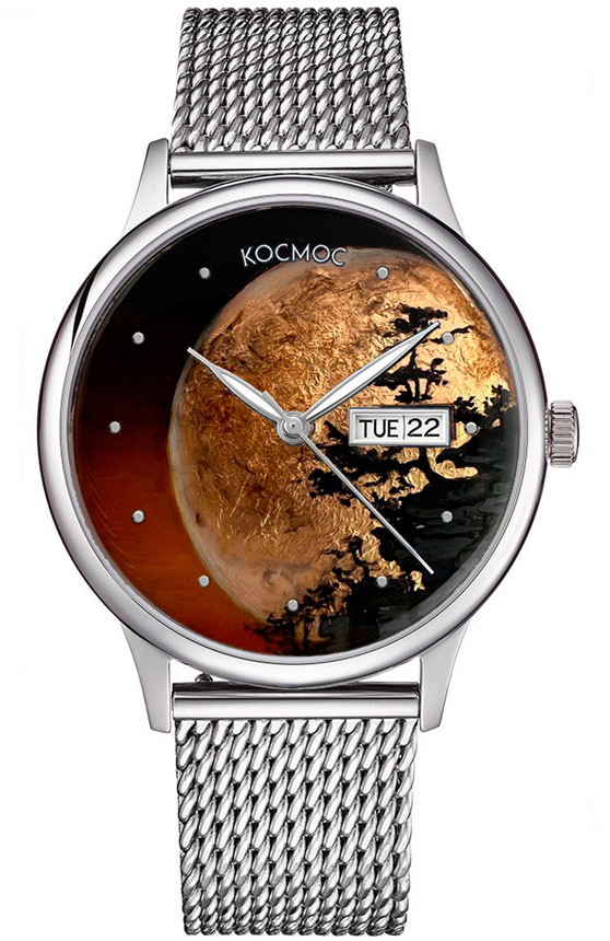 Суперлунием называют момент, когда полная Луна подходит к Земле на расстояние ближе 362 тысяч километров. Диск при этом светится ярче на треть, диаметр спутника выглядит больше на 15%. Это, несомненно, эффектное астрономическое явление отражено в сюжете лаковой миниатюры на циферблате часов Космос. На основу наносится тончайший лист фольги, следом - несколько слоев лака и краски. Их чередование создает эффект объема и ощущение динамики. Постепенно прорисовываются детали: на один сюжет требуется до 50 часов работы. Процесс запекания миниатюры в специальной печи придает рисунку необходимый блеск и завершенность. Часы созданы в единственном экземпляре. В часах установлен механизм TMI с функцией автоподзавода. Кроме часов, минут и секунд здесь предусмотрены дата и день недели. Их индикатор, выделенный накладной рамкой, вы найдете в позиции «3 часа». За движением деталей механизма можно наблюдать, стоит только перевернуть часы: задняя крышка прозрачна. Часовая и минутная стрелка покрыты люминесцентным составом, который светится в темноте. Минеральное стекло сделано по технологии, характерной для 60-70-х годов прошлого века: оно выпуклое с обеих сторон. Нити из нержавеющей стали в браслете складываются в особое плетение, названное «миланским». Оно придает браслету гибкости, сохраняя прочность. Специальная застежка позволяет легко регулировать длину браслета самостоятельно.