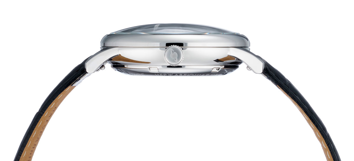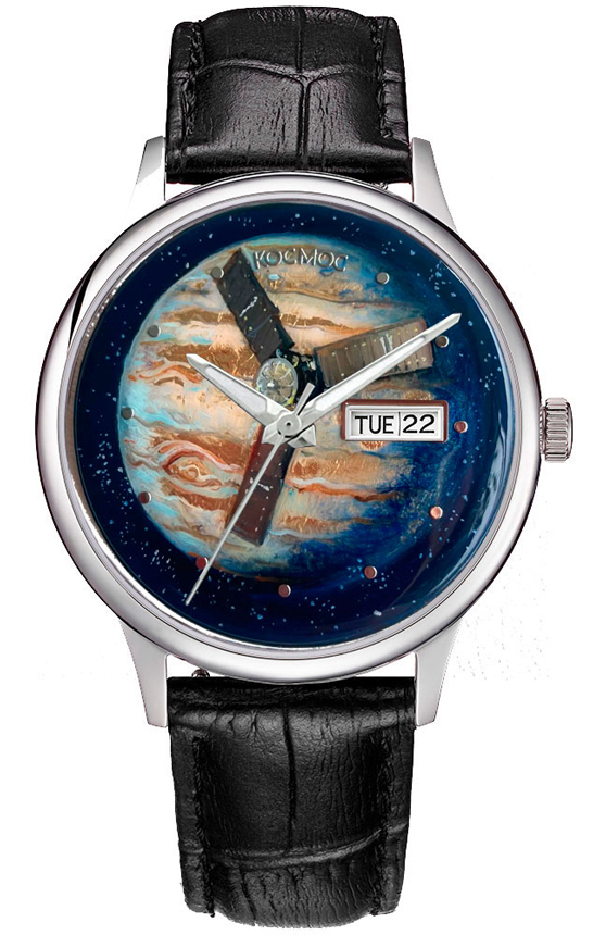 Автоматическая межпланетная станция Юнона стала первым космическим аппаратом, который летом 2016 года вышел на полярную орбиту Юпитера. Сквозь слои лака и краски просвечивается тончайший лист фольги: этот прием используется для передачи неоднородности поверхности и создания эффекта объема. Процесс постепенной прорисовки деталей довольно длительный: на один сюжет художнику требуется до 50 часов работы. После следует запекание миниатюры в специальной печи, что придает рисунку необходимый блеск и завершенность. В часах установлен механизм TMI с функцией автоподзавода. Кроме часов, минут и секунд здесь предусмотрены дата и день недели. Часовая и минутная стрелка покрыты люминесцентным составом, который светится в темноте. Минеральное стекло сделано по технологии, характерной для 60-70-х годов прошлого века: оно выпуклое с обеих сторон. Ремешок модели сделан из натуральной кожи с прошивкой.