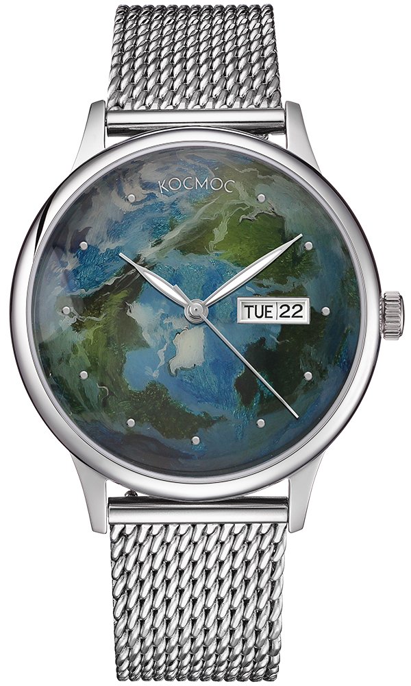 Уникальность планеты Земля неоспорима. Ведь только здесь существует биосфера: горы и пустыни, морские глубины и бескрайние леса. Человек, появившийся на Земле примерно 2,4 миллиона лет назад, совсем недавно получил возможность любоваться планетой из космоса. Такие снимки до сих пор вызывают безмерное восхищение и гордость. Теперь смотреть на Землю с этого ракурса можно, взглянув на циферблат часов Космос. Для создания модели серии Уникальные часы художники бренда выбрали технику лаковой миниатюры. На основу наносится несколько слоев лака и краски, их чередование создает эффект объема и ощущение динамики. Постепенно прорисовываются детали, добавляется серебряная или золотая фольга: на один сюжет требуется до 50 часов работы. Процесс запекания миниатюры в специальной печи придает рисунку необходимый блеск и завершенность. В часах установлен механизм TMI с функцией автоподзавода. Кроме часов, минут и секунд здесь предусмотрены дата и день недели. Их индикатор, выделенный накладной рамкой, вы найдете в позиции «3 часа». За движением деталей механизма можно наблюдать, стоит только перевернуть часы: задняя крышка прозрачна. Часовая и минутная стрелка покрыты люминесцентным составом, который светится в темноте. Минеральное стекло сделано по технологии, характерной для 60-70-х годов прошлого века: оно выпуклое с обеих сторон. Нити из нержавеющей стали в браслете складываются в особое плетение, названное «миланским». Оно придает браслету гибкости, сохраняя прочность. Специальная застежка позволяет легко регулировать длину браслета самостоятельно.