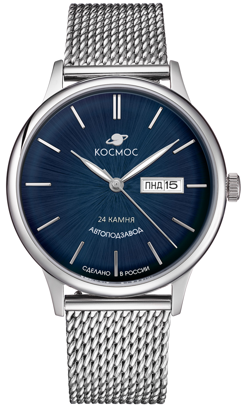 Мужские часы Юпитер марки Космос уникальны по своей сути. С одной стороны, они отражают традиции часового мастерства 60-70х годов, эпоху покорения космического пространства, с другой стороны, они ведут нас в будущее, предлагая задуматься о нем. Они помогают задержаться в настоящем и насладиться высоким качеством и смыслом, заложенным в каждой детали. Полированный корпус часов напоминает силуэт летающей тарелки благодаря выпуклым формам стекла и нижней части корпуса. Дополняют образ стальные ушки корпуса, напоминающие ее опоры. На задней крышке часов выгравирован фантазийный сюжет – космическая станция будущего. Модель мужских часов демонстрирует точную работу японского механизма с автоподзаводом на 24 рубинах. Синий циферблат выполнен в ретро стиле, края его выгнуты, для чего требуется использование сложной технологии в производстве. Циферблаты такой формы создавали в часах прошлых лет. Кончик секундной стрелки выгнут по форме циферблата. На выпуклом градиентном циферблате выполнена шлифовка в стиле солнечных лучей и размещены изготовленные вручную индексы, которые крепятся на двух штифтах. В модели представлены дополнительные функции даты и дня недели. На часовую, минутную стрелки, и круг по краю циферблата, напоминающий ореол по краю Земли, нанесено люминесцентное покрытие, которое светится в темноте, создавая необычное изображение. Детально разработана и форма минерального стекла, которое выгнуто не только снаружи, но и изнутри. Такое стекло не искажает изображение на циферблате в отличие от того, внутренняя часть которого остается прямой и создает эффект линзы. Технология производства выпуклого стекла очень сложна при выведении двух параллельно изогнутых поверхностей. Точильный аппарат должен быть максимально точный, иначе стекло может лопнуть при изготовлении. В модели установлен стальной браслет миланского плетения с дополнительной защитой от случайного падения. Заводная головка, застежка и ремешок украшены фирменным логотипом.