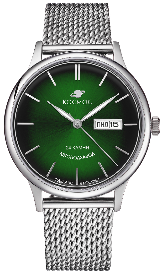 Мужские часы Космос Юпитер уникальны по своей сути. Они отражают традиции часового мастерства 60-70х годов, эпоху покорения космического пространства. Полированный корпус часов напоминает силуэт летающей тарелки благодаря выпуклым формам стекла и нижней части корпуса. Дополняют образ стальные ушки корпуса, напоминающие ее опоры. Зелёный циферблат выполнен в ретро стиле, края его выгнуты, для чего требуется использование сложной технологии в производстве. Циферблаты такой формы создавали в часах прошлых лет. Кончик секундной стрелки выгнут по форме циферблата. На выпуклом градиентном циферблате выполнена шлифовка в стиле солнечных лучей и размещены изготовленные вручную индексы, которые крепятся на двух штифтах. В модели представлены дополнительные функции даты и дня недели. На часовую, минутную стрелки, и круг по краю циферблата, напоминающий ореол по краю Земли, нанесено люминесцентное покрытие, которое светится в темноте, создавая необычное изображение. Функции: часы, минуты, секунды, дата, день недели.