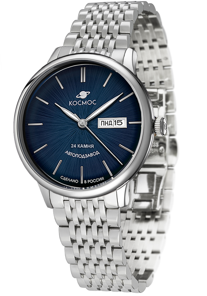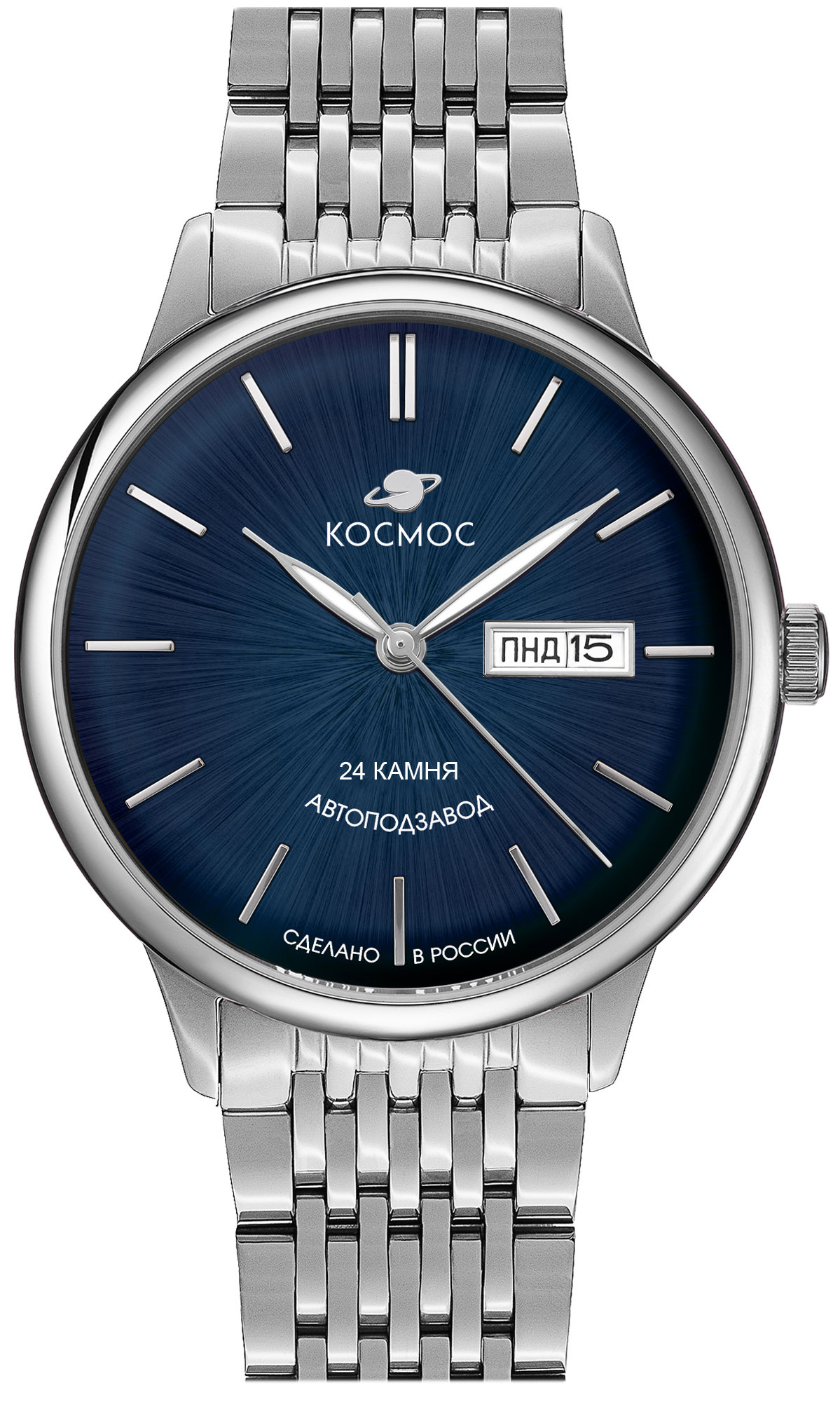 Мужские часы Космос Юпитер уникальны по своей сути. Они отражают традиции часового мастерства 60-70х годов, эпоху покорения космического пространства. Полированный корпус часов напоминает силуэт летающей тарелки благодаря выпуклым формам стекла и нижней части корпуса. Дополняют образ стальные ушки корпуса, напоминающие ее опоры. Тёмно-синий циферблат выполнен в ретро стиле, края его выгнуты, для чего требуется использование сложной технологии в производстве. Циферблаты такой формы создавали в часах прошлых лет. Кончик секундной стрелки выгнут по форме циферблата. На выпуклом градиентном циферблате выполнена шлифовка в стиле солнечных лучей и размещены изготовленные вручную индексы, которые крепятся на двух штифтах. В модели представлены дополнительные функции даты и дня недели. На часовую, минутную стрелки, и круг по краю циферблата, напоминающий ореол по краю Земли, нанесено люминесцентное покрытие, которое светится в темноте, создавая необычное изображение. Функции: часы, минуты, секунды, дата, день недели.