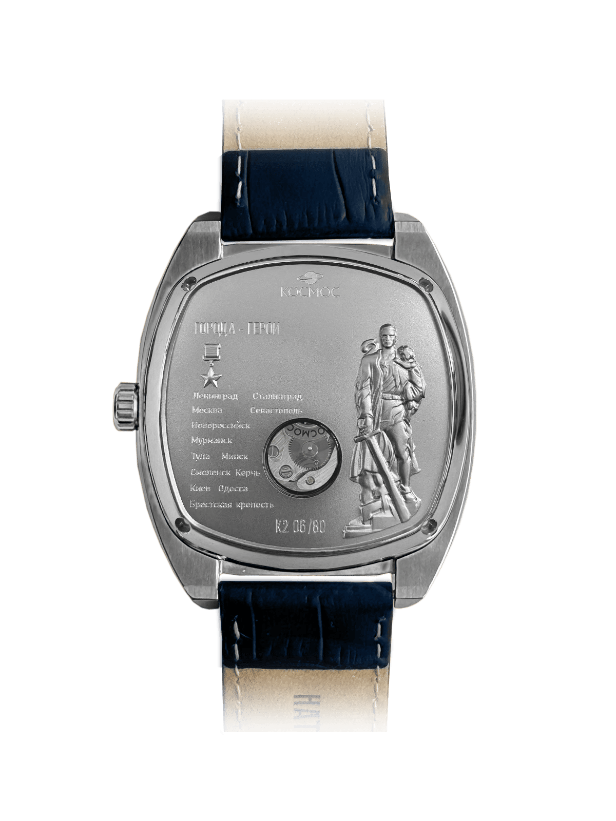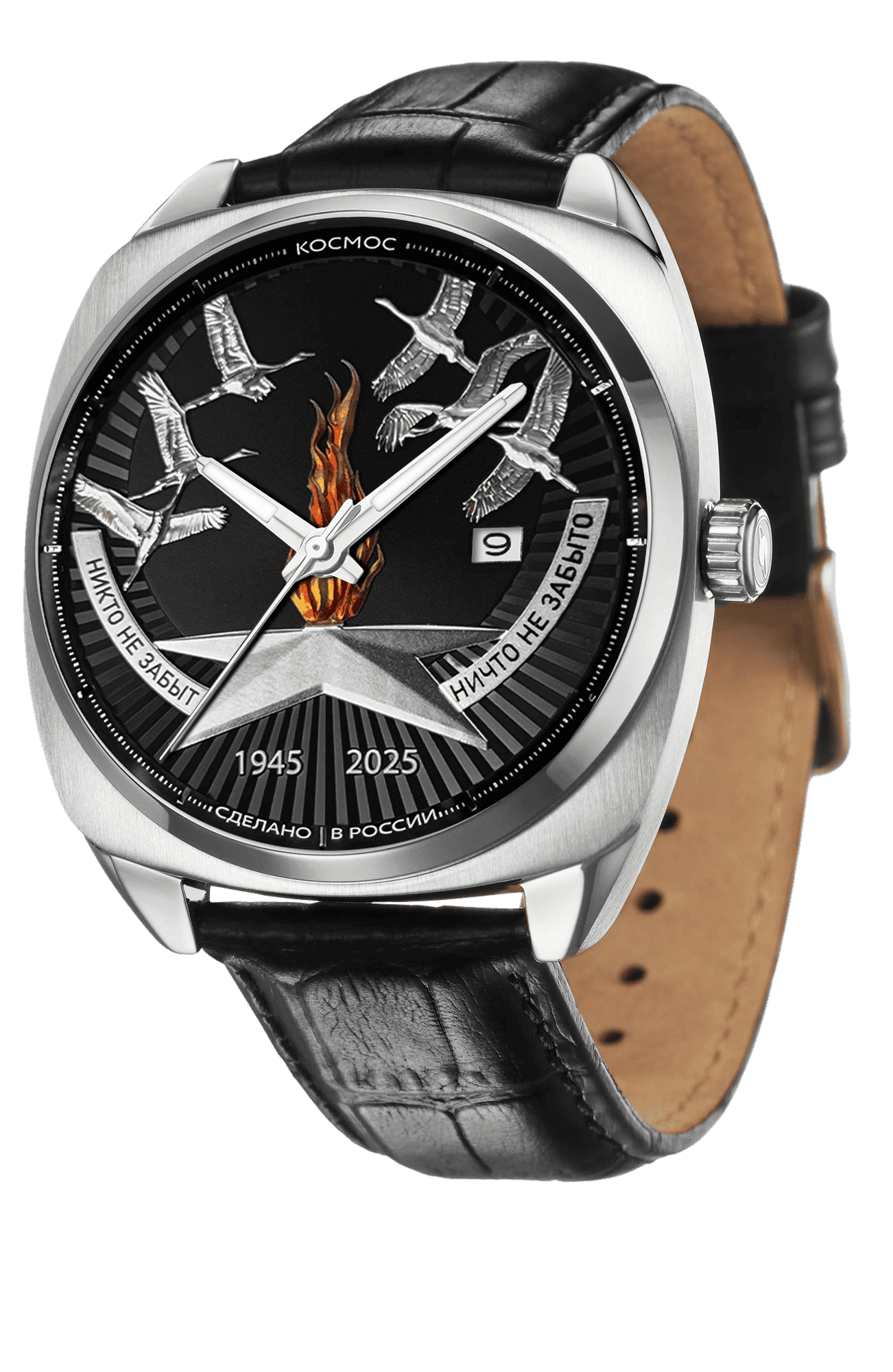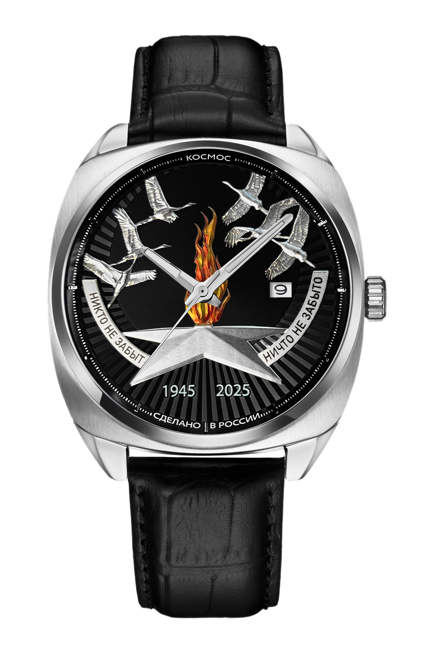 В честь 80-летия Великой Победы бренд «Космос» выпускает уникальную серию часов «80 лет Победы», посвященную героям, отстоявшим мир и свободу в годы Великой Отечественной войны. На циферблате черного цвета «горит» Вечный огонь, накладной элемент в виде объемной пятиконечной звезды и языков пламени. Над Вечным огнем парят журавли, трогательный символ памяти о солдатах, не вернувшихся с поля боя. На специальной пластине можно прочитать строки из стихотворения Ольги Берггольц, написанные в 1959 году: «Никто не забыт, ничто не забыто». На задней крышке часов выгравированы имена 12 городов-героев и Брестской крепости, которая первой почувствовала агрессию захватчиков. Еще одна гравировка, украшающая заднюю крышку — памятник воину-освободителю, держащему на руках маленькую немецкую девочку, символ освобождения народов Европы от нацизма. Коллекция выпущена в двух сериях по 80 экземпляров каждая. На задней крышке часов находится индивидуальный номер в формате хх/80. Функции: часы, минуты, секунды, дата.