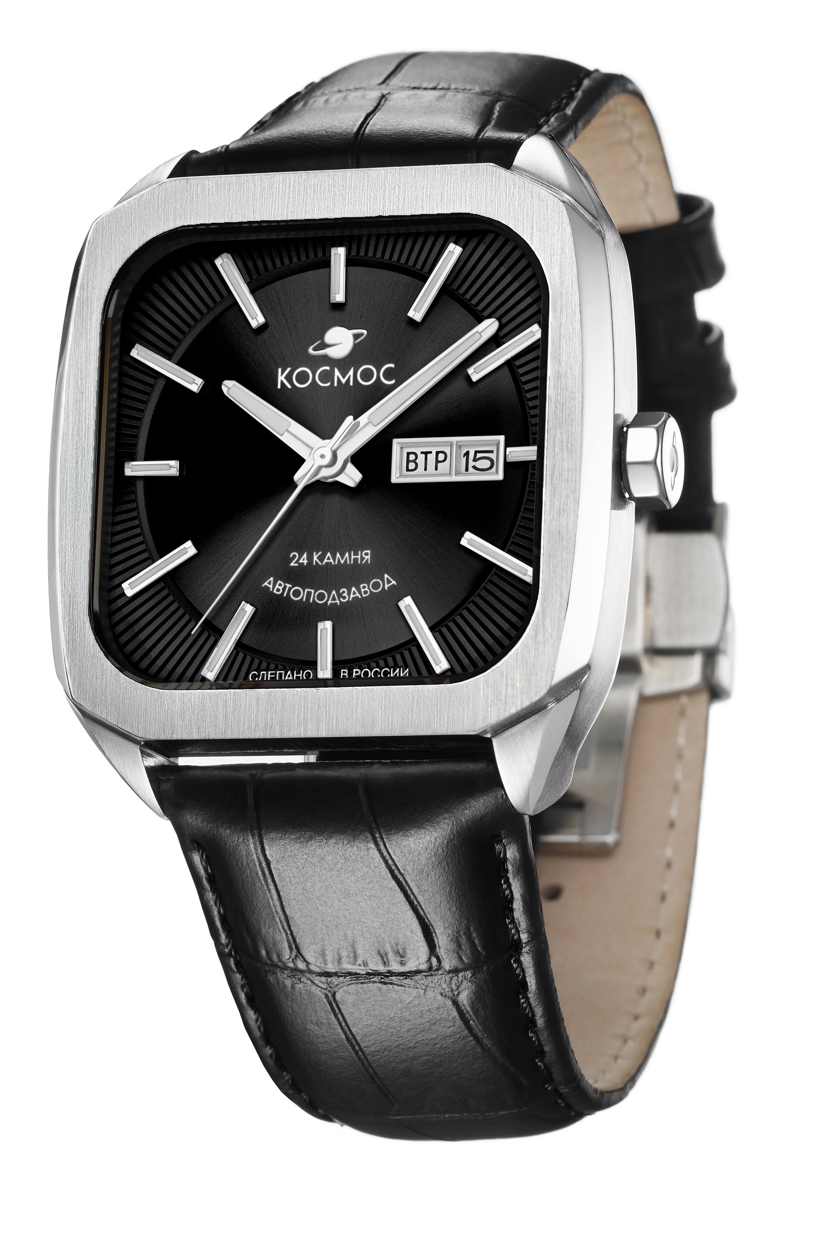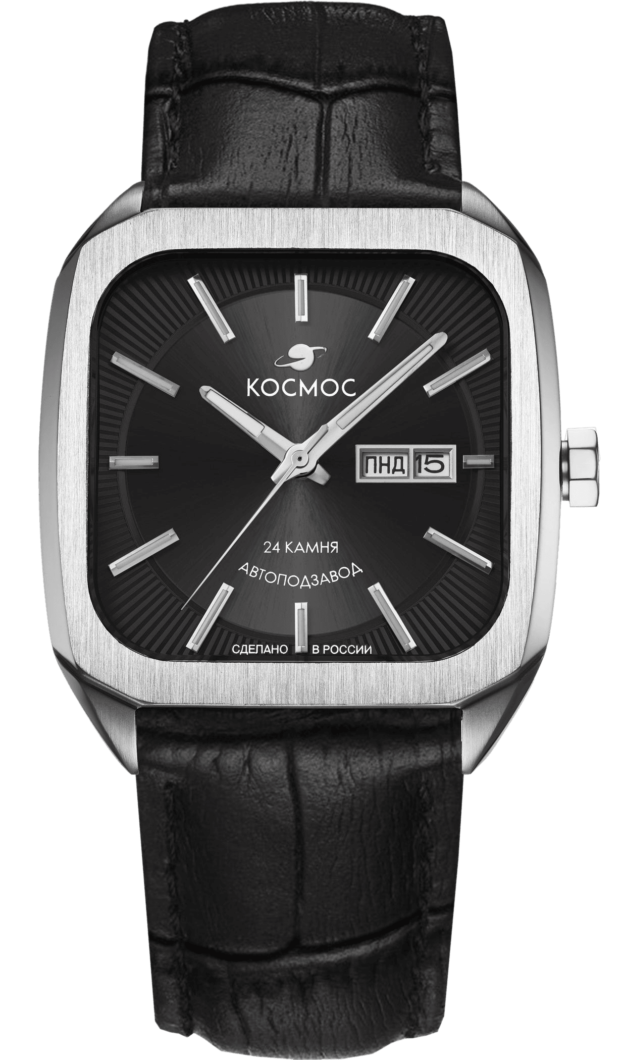 Лимитированная серия бренда Космос получила название Марсоход, в честь аппарата, способного передвигаться по поверхности красной планеты. Марсоход ассоциируется с брутальностью, мастерством и технической сложностью. Наша страна дважды запускала подобные аппараты еще в 70-х годах прошлого века. Дизайн часов серии Марсоход вдохновлен лучшими работами и традициями советских мастеров, в его основе - современные технологии часового искусства и обаяние стиля ретро. Корпус часов в форме квадрата с закругленными углами сделан из нержавеющей стали, украшенной зеркальной полировкой и сатинированием. Удобная заводная головка имеет форму гайки. Задняя крышка прозрачная, что традиционно для механических часов. Сквозь это специальное окошко можно увидеть работу механизма TMI. Его подвижный ротор не только позволяет заводить пружину механизма от обычных движений руки, но и несет важную информацию: «Сделано в России». Украшением служит гравировка, изображающая космонавта. Задняя крышка крепится на четырех винтах, что обеспечивает повышенную водостойкость в 100 метров. Цифры в формате от 01/50 до 50/50 обозначают индивидуальный номер модели. Ушки корпуса имеют эргономичную форму — это позволяет часам комфортно лежать на запястье. Объемный циферблат черного цвета состоит из двух уровней. В центре первого движутся три стрелки, часовая и минутная - с люминесцентным покрытием. Второй уровень декорирован гильоше в виде солнечных лучей. Индексы накладные, как и стальная рамка, выделяющая сдвоенное окошко даты и дня недели. Обратите внимание, что для индикации дня недели используется два языка: русский и английский. Сапфировое стекло с антибликовым покрытием обеспечивает защиту циферблата и хорошую читаемость показаний, независимо от условий видимости. Ремешок часов изготовлен из натуральной кожи черного цвета, заводная головка, застежка и ремешок украшены фирменным логотипом.