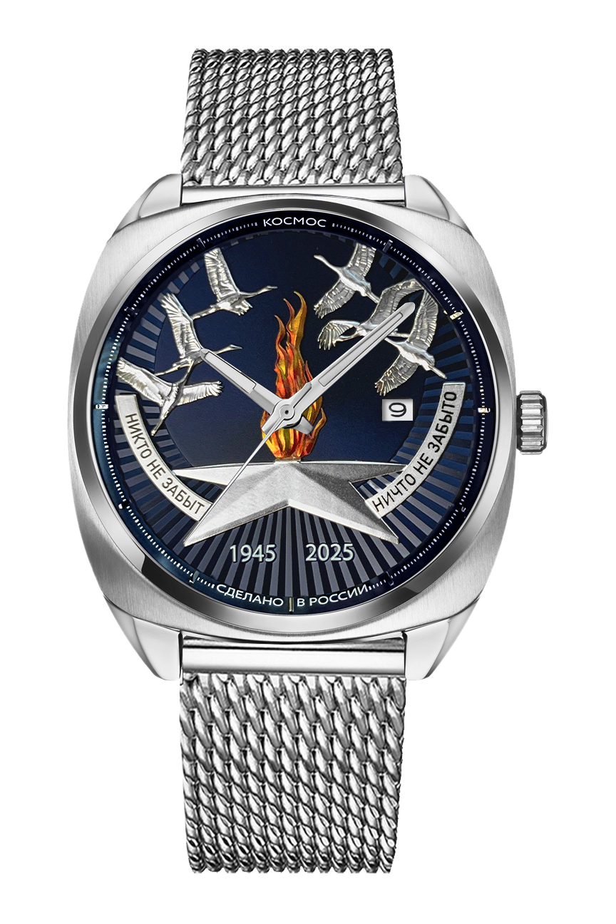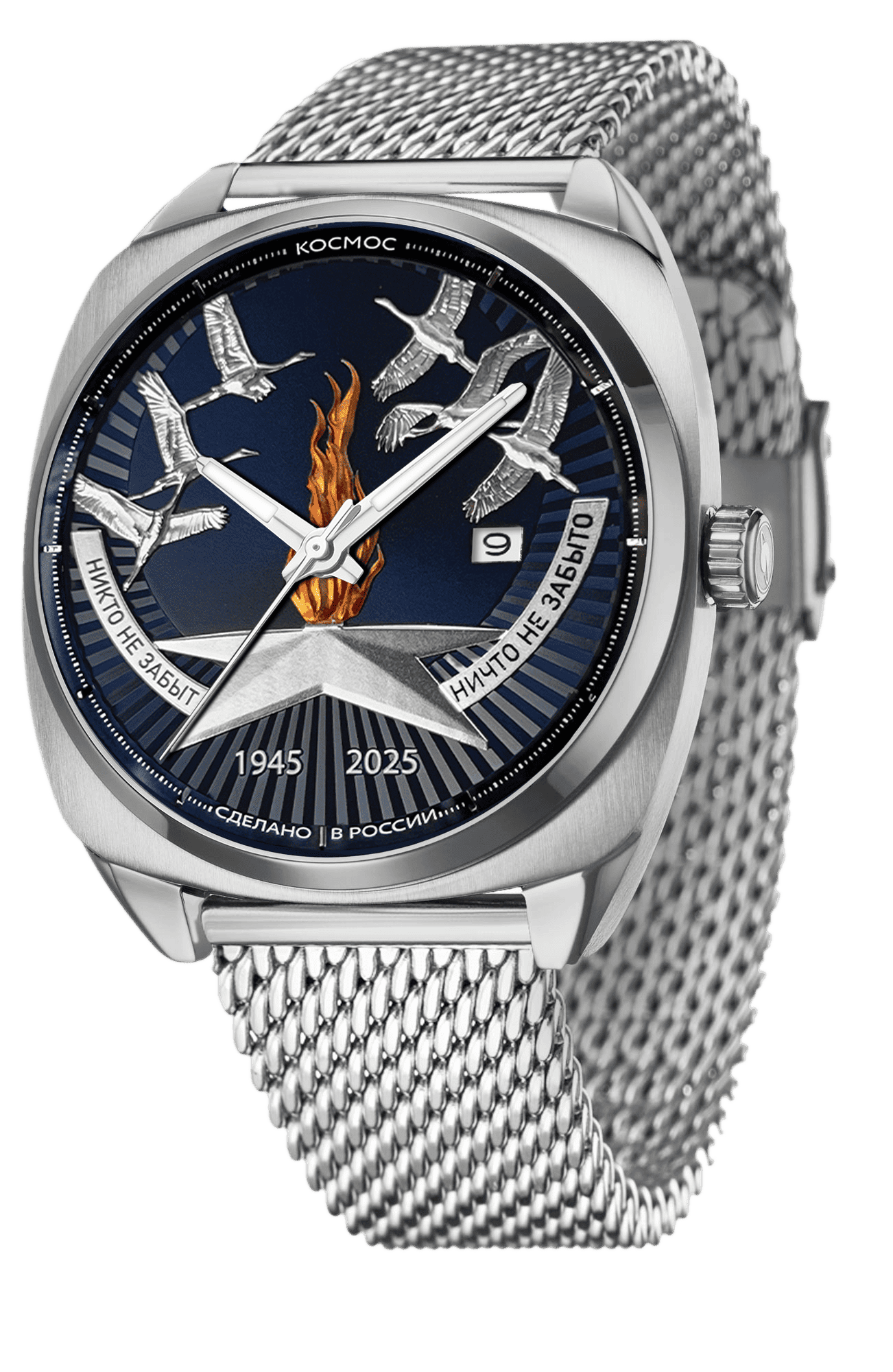 В честь 80-летия Великой Победы бренд «Космос» выпускает уникальную серию часов «80 лет Победы», посвященную героям, отстоявшим мир и свободу в годы Великой Отечественной войны. На циферблате синего цвета «горит» Вечный огонь, накладной элемент в виде объемной пятиконечной звезды и языков пламени. Над Вечным огнем парят журавли, трогательный символ памяти о солдатах, не вернувшихся с поля боя. На специальной пластине можно прочитать строки из стихотворения Ольги Берггольц, написанные в 1959 году: «Никто не забыт, ничто не забыто». На задней крышке часов выгравированы имена 12 городов-героев и Брестской крепости, которая первой почувствовала агрессию захватчиков. Еще одна гравировка, украшающая заднюю крышку — памятник воину-освободителю, держащему на руках маленькую немецкую девочку, символ освобождения народов Европы от нацизма. Коллекция выпущена в двух сериях по 80 экземпляров каждая. На задней крышке часов находится индивидуальный номер в формате хх/80. Функции: часы, минуты, секунды, дата.