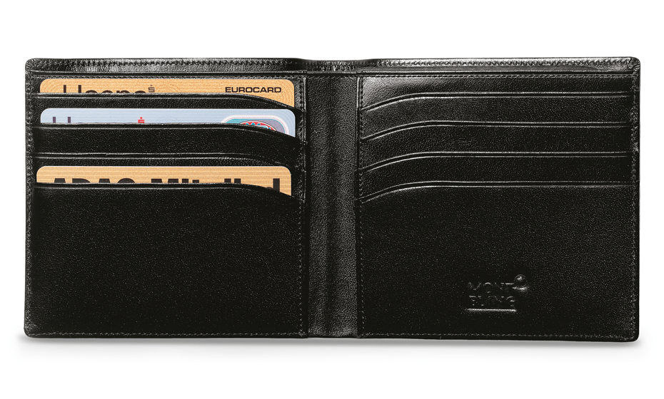 Бумажник 8 сс из зернистой европейской яловичной кожи насыщенного оттенка, подкладка из жаккарда с фирменной маркировкой Montblanc, эмблема Montblanc и кольцо с палладиевым напылением, 8 отделений для кредитных карт, 2 отделения для купюр, 2 дополнительных отделения.