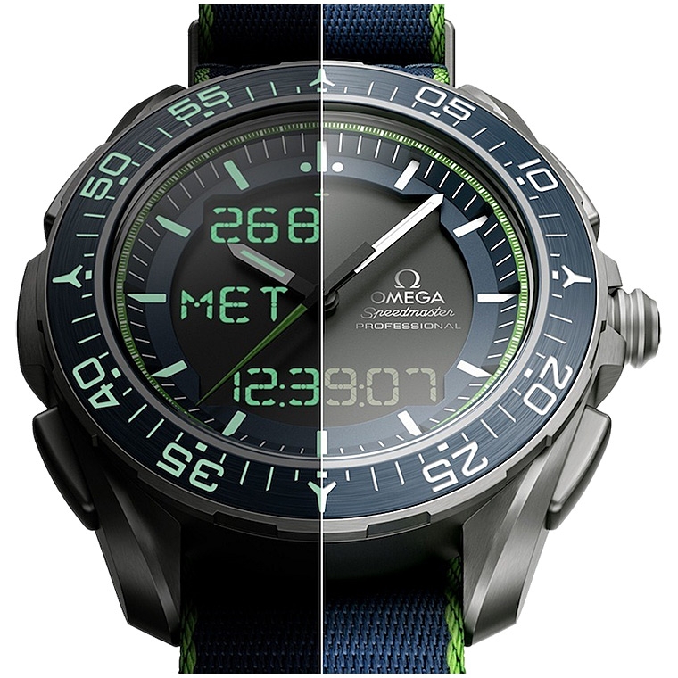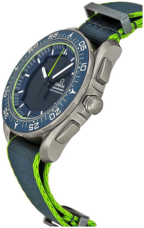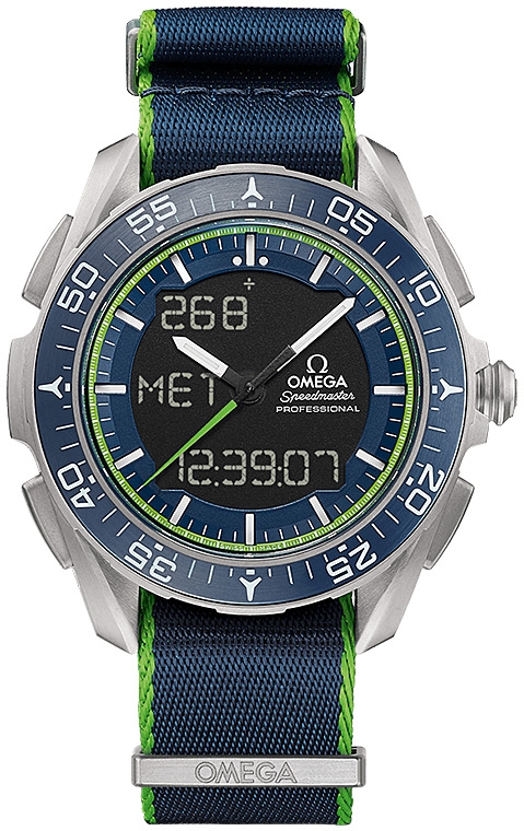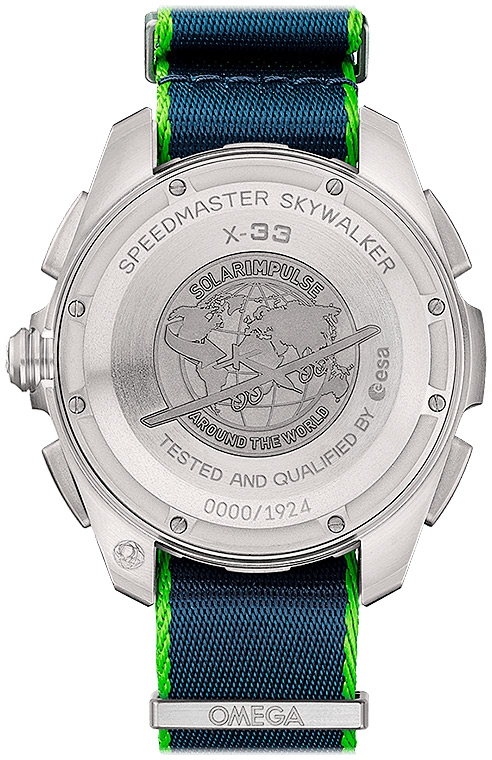 Модель Speedmaster Skywalker X-33 Solar Impulse Limited Edition – это не просто яркие часы: они посвящены проекту, главная цель которого – облететь вокруг Земли на самолете, приводимом в движение исключительно солнечной энергией. В центре аналогового сине-зеленого циферблата с белыми индексами и часовыми метками, нанесенными переводным способом и покрытыми белым люминесцентным составом Super-LumiNova, находится жидкокристаллический цифровой дисплей. Часы Speedmaster Skywalker X-33 Solar Impulse Limited Edition из титана 2 оснащены многофункциональным кварцевым часовым механизмом с хронографом OMEGA, калибр 5619. На их задней крышке из титана Grade 2 выштампованы эмблема Solar Impulse «Around the World», название модели и надпись «TESTED AND QUALIFIED BY ESA» (ESA – Европейское космическое агентство). Выпускаемая ограниченной серией из 1924 экземпляров модель дополнена ремешком NATO из полиамида синего цвета с зеленой окантовкой. Функции: будильник; вечный календарь;вращающийся в обоих направлениях безель; функция мирового времени; хронограф. Международная гарантия 5 лет.