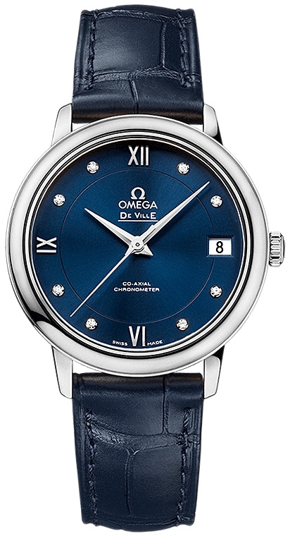 Коллекция OMEGA De Ville Prestige завоевала любовь поклонников бренда своим классическим элегантным дизайном. Данная модель имеет впечатляющий синий циферблат с делением на две зоны, радиальным сатинированием, бриллиантовыми часовыми метками и римскими цифрами 6, 9 и 12. Этот эффектный циферблат с окошком указателя даты в положении «3 часа» защищен устойчивым к царапинам сапфировым стеклом. Безель закреплен на корпусе диаметром 32,7 мм из нержавеющей стали с синим кожаным ремешком. Основу этой модели составляет коаксиальный калибр 2500.