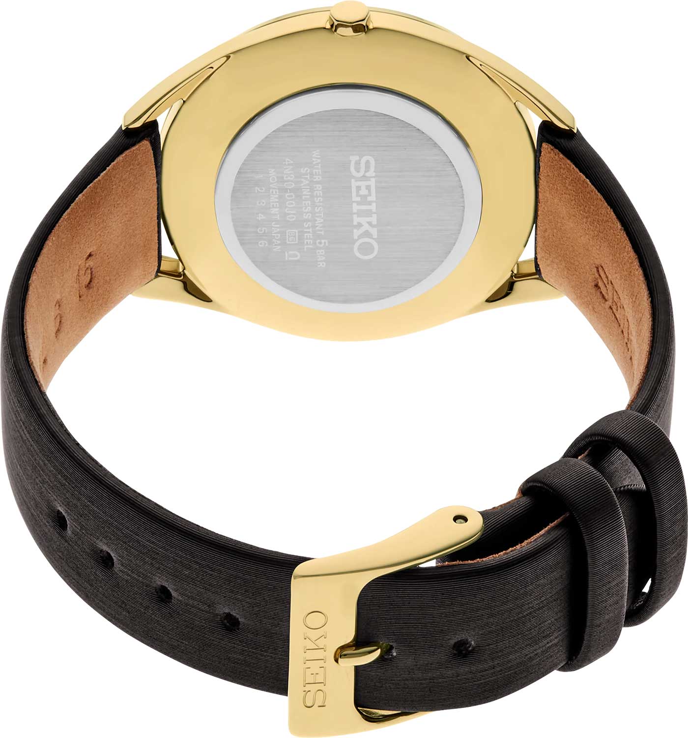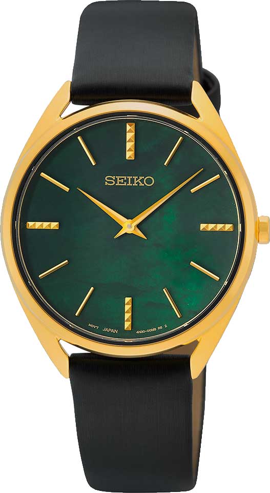 Корпус диаметром 32 мм выполнен из нержавеющей стали 316L с PVD-покрытием золотого цвета. Часы кварцевые. Стекло минеральное закаленное - Hardlex. Циферблат зеленый перламутр. Водозащита 50 метров. Черный кожаный ремень . Функции: часы, минуты.