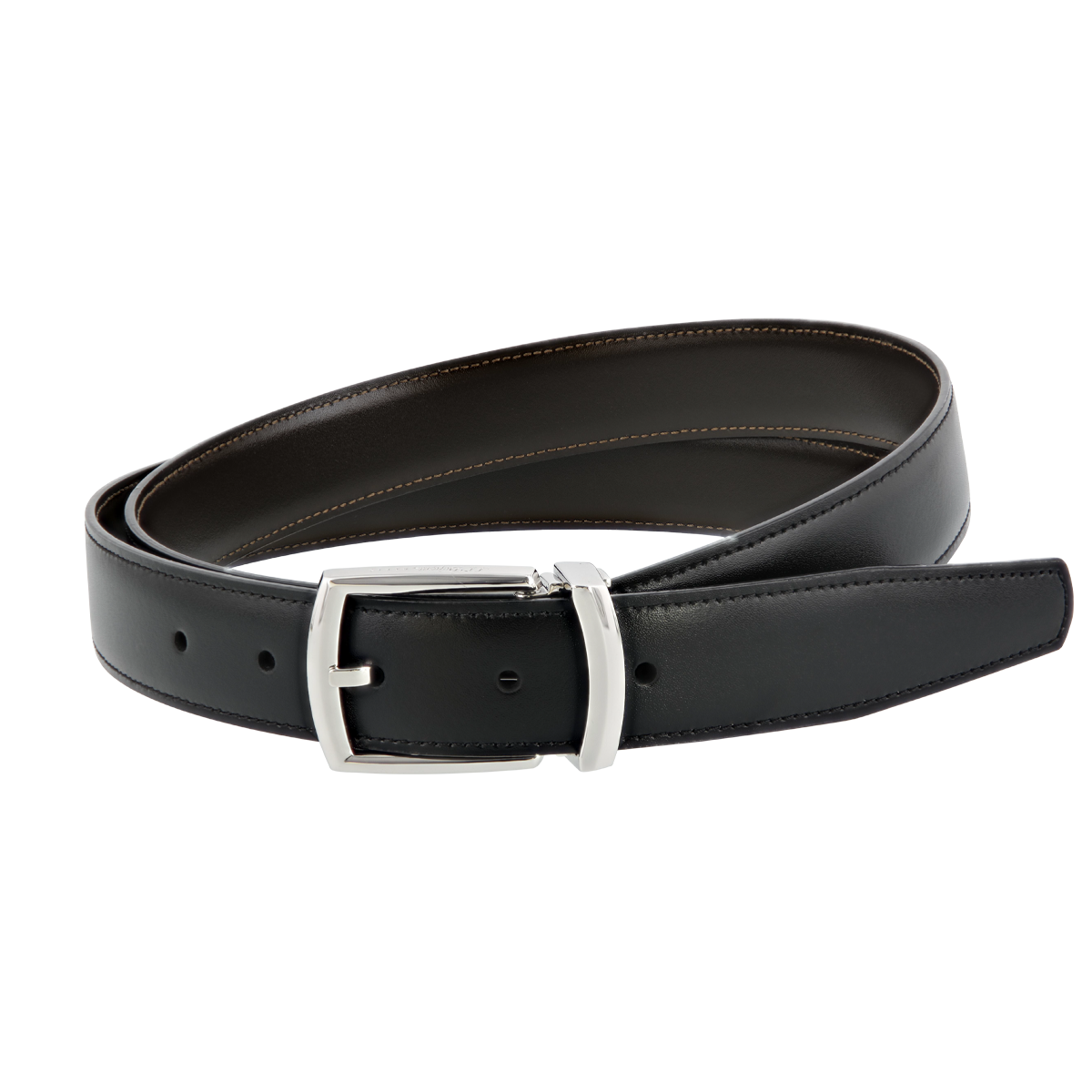 Элегантный двусторонний ремень из кожи теленка черного и коричневого цветов в сочетании с классической пряжкой прекрасно подойдет как к деловому костюму, так и к более непринужденному облику. Размер: 125x3 см.