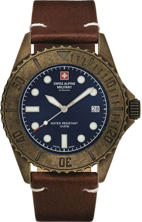 Корпус диаметром 42 мм выполнен из нержавеющей стали 316L с "бронзовым" PVD-покрытием. Часы кварцевые. Стекло сапфировое. Циферблат синего цвета. Метки и стрелки часов покрыты люминисцентным составом,что обеспечивает их свечение в темноте. Водозащита 100 метров. Коричневый кожаный ремень. Функции: часы, минуты, секунды, дата.