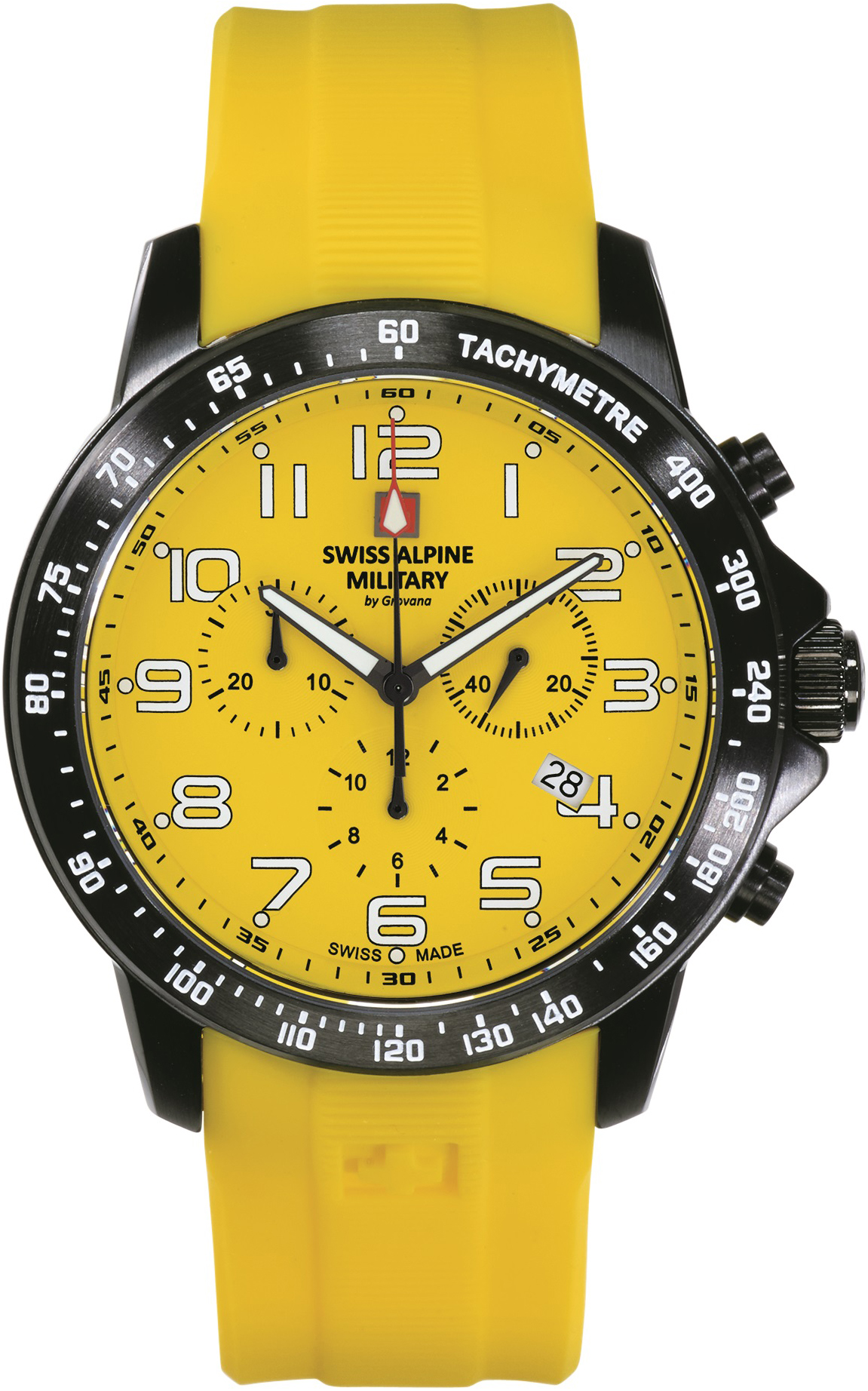 Корпус диаметром 44 мм выполнен из нержавеющей стали 316L с черным PVD-покрытием. Часы кварцевые с хронографом. Стекло сапфировое. Циферблат желтого цвета. Метки и стрелки часов покрыты люминисцентным составом,что обеспечивает их свечение в темноте. Водозащита 100 метров. Желтый резиновый ремень.Функции: часы, минуты, секунды, дата, хронограф, тахиметрическая шкала.