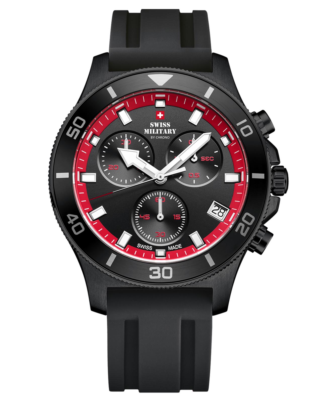 Корпус диаметром 42,5 мм выполнен из нержавеющей стали 316L с черным PVD-покрытием. Часы кварцевые с хронографом. Стекло минеральное. Циферблат черного цвета с красной минутной шкалой. Хорошо читаемые стрелки и часовые метки люминесцентные и светятся в темноте. Черный резиновый ремень. Водозащита 50 метров. Функции: часы, минуты, секунды, дата, хронограф.