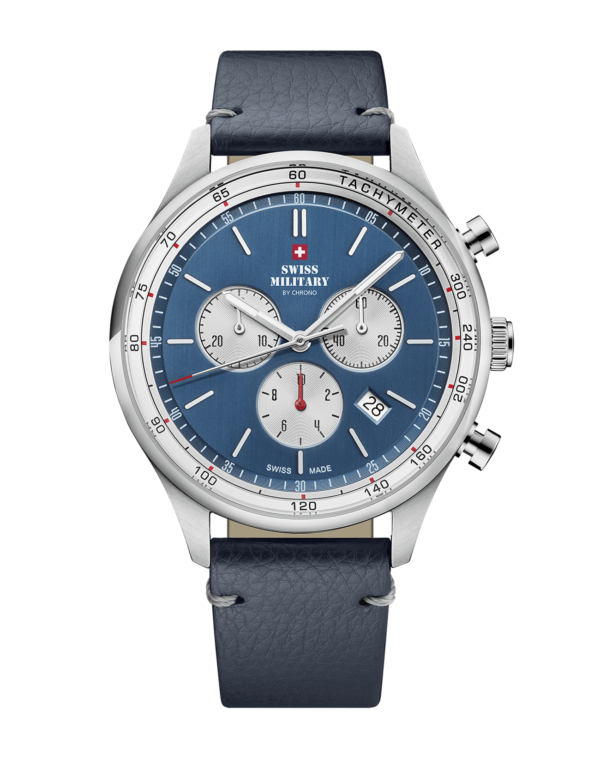 Корпус диаметром 42 мм выполнен из нержавеющей стали 316L . Часы кварцевые с хронографом. Стекло минеральное. Циферблат синего цвета с белыми счетчиками хронографа. Синий кожаный ремень. Хорошо читаемые стрелки и часовые метки люминесцентные и светятся в темноте. Водозащита 100 метров. Функции: часы, минуты, секунды, дата, хронограф.