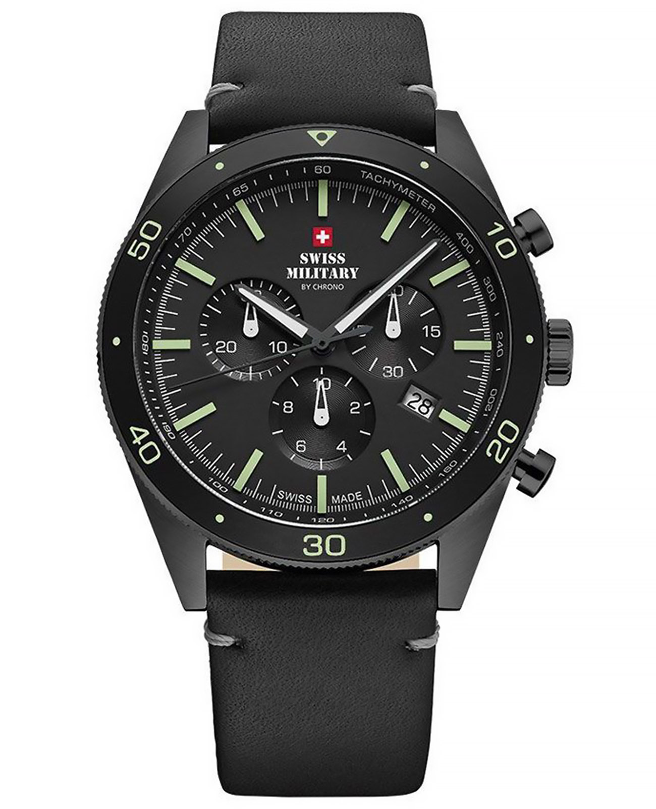 Корпус диаметром 43 мм выполнен из нержавеющей стали 316L с черным PVD-покрытием. Часы кварцевые с хронографом. Стекло минеральное. Циферблат черного цвета. Черный кожаный ремень. Стрелки и метки с люминесцентным покрытием светятся в темноте. Водозащита 100 метров. Функции: часы, минуты, секунды, дата, хронограф.